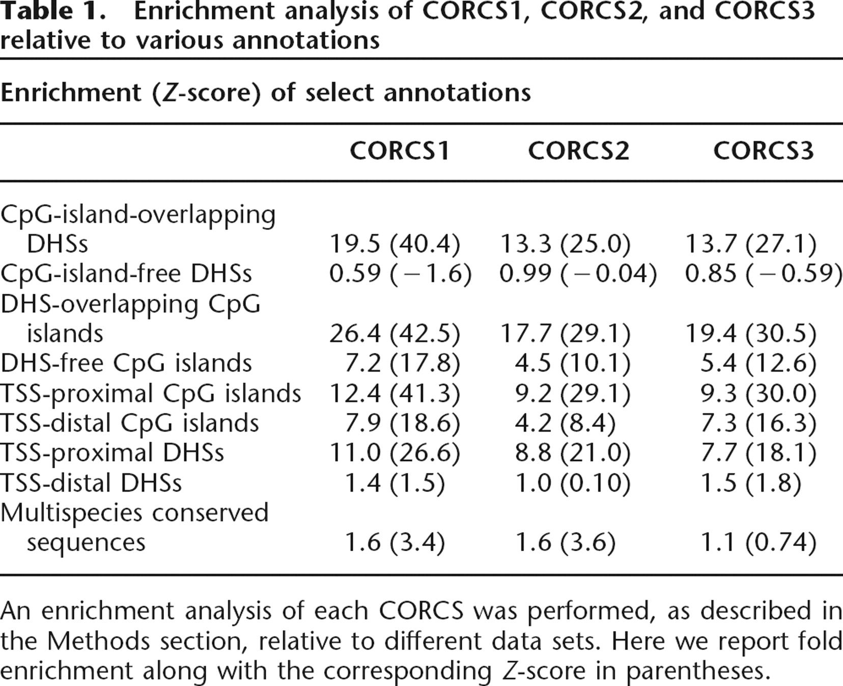 An enrichment analysis of each CORCS was performed, as described in the Methods section, relative to different data sets. Here we report fold enrichment along with the corresponding Z-score in parentheses.