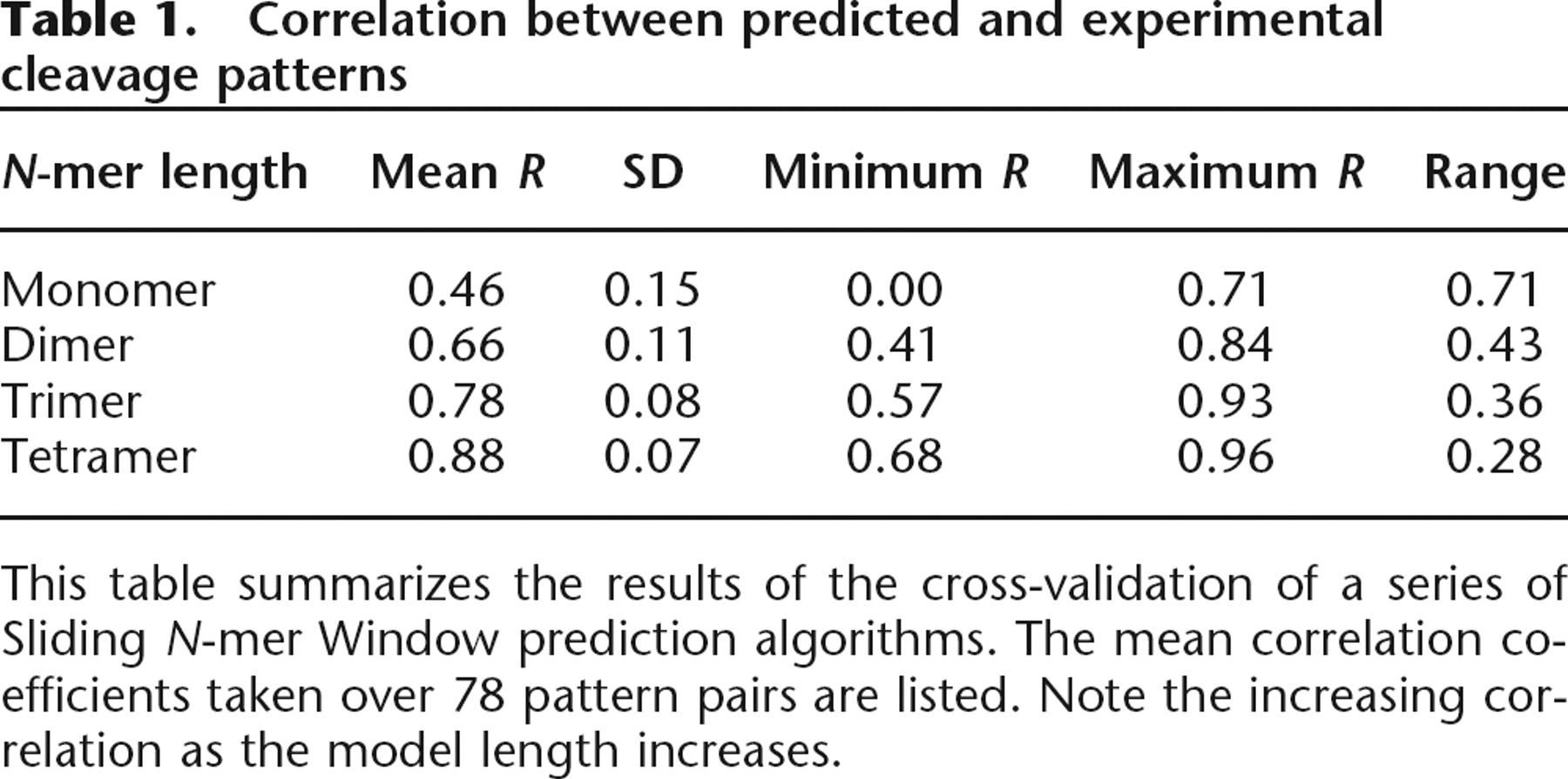 This table summarizes the results of the cross-validation of a series of Sliding N-mer Window prediction algorithms. The mean correlation coefficients taken over 78 pattern pairs are listed. Note the increasing correlation as the model length increases.