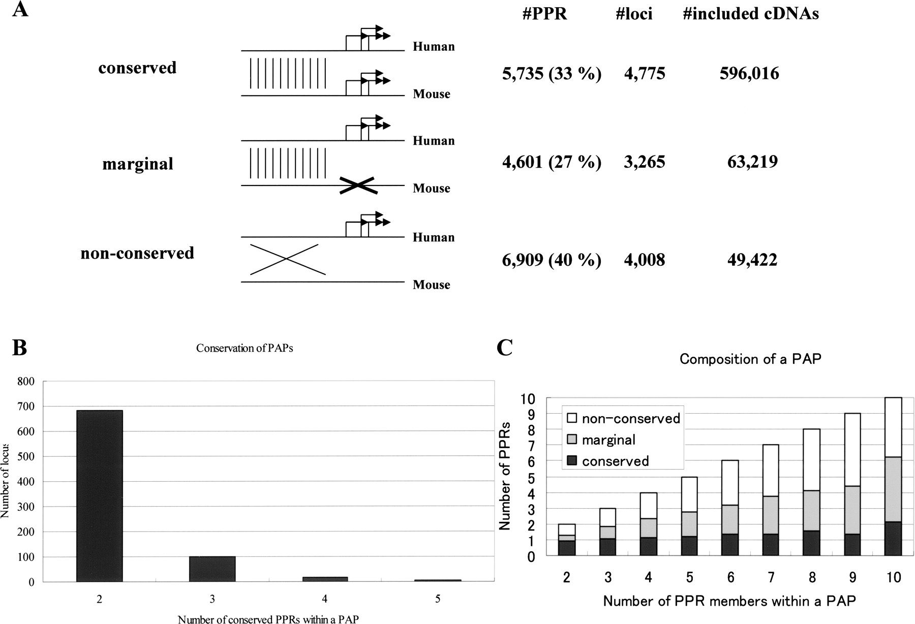 Evolutionary conservation of PAPs. (A) Patterns of evolutionary conservation and the number of PPRs belonging to each of the categories. Lines and arrows show the genomic sequence and mapped positions of the TSSs, respectively. Alignable regions are indicated as regions connected by vertical lines. For details, also see the text. (B) Number of loci in which the indicated number of PPR members are “conserved.” (C) Composition of the PAP in terms of average numbers of “conserved,” “marginal,” and “non-conserved” PPRs. When a PAP is consisted of the indicated number of PPR members (X-axis), how many of the PPRs are “conserved” (solid bar), “marginal” (gray bar), or “non-conserved” (white bar) on average are shown.