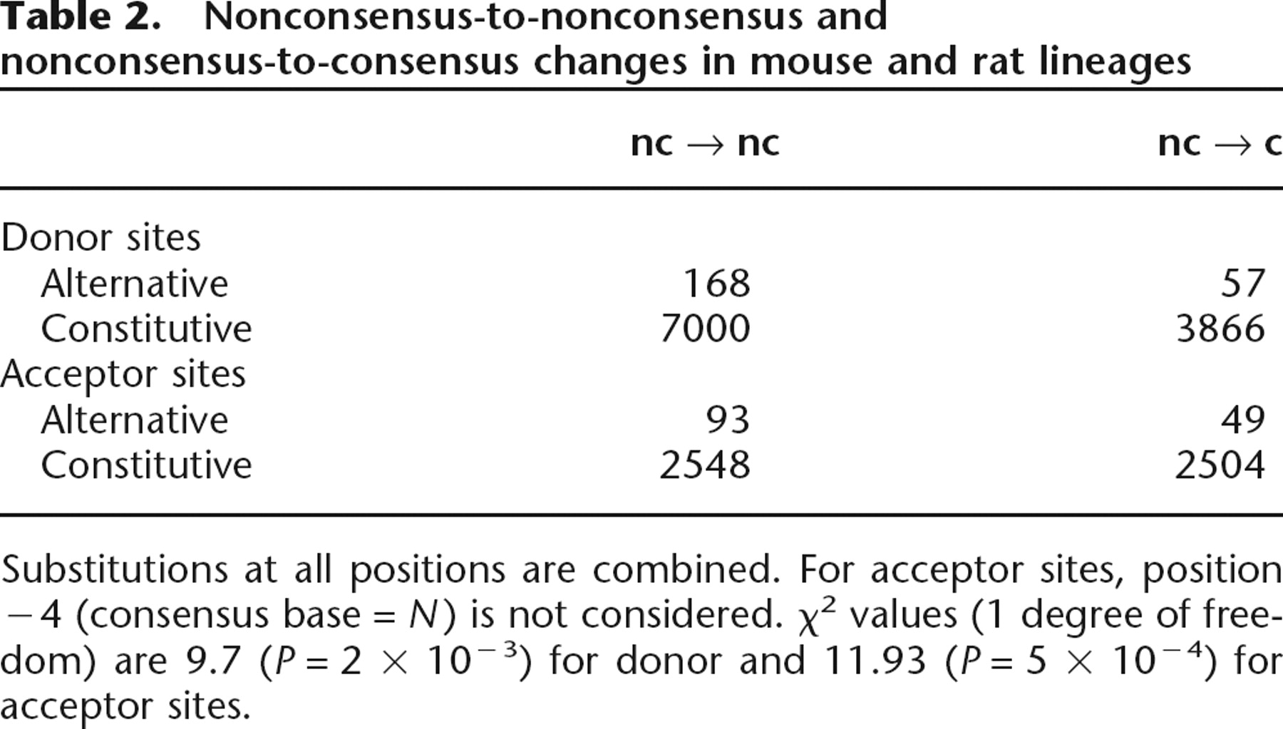 Substitutions at all positions are combined. For acceptor sites, position −4 (consensus base = N) is not considered. χ2 values (1 degree of freedom) are 9.7 (P = 2 × 10−3) for donor and 11.93 (P = 5 × 10−4) for acceptor sites.