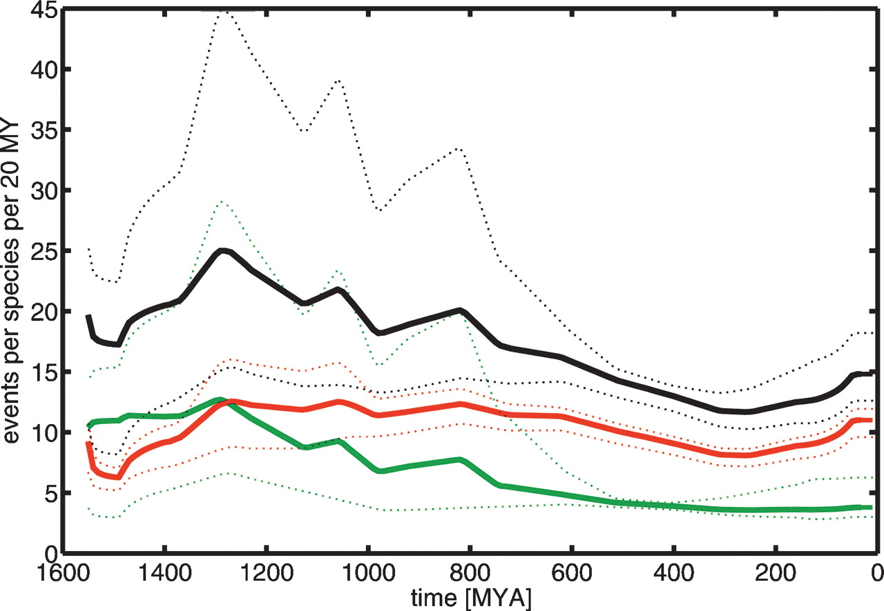 Time dependence of the overall number of intron gain and loss events during eukaryotic evolution. (Green lines) Number of gain events, (red lines) number of loss events, (black lines) total number of events per species per 20 million yr (Myr). Events were counted in a 20-Myr window every 10 Myr. The results were smoothed using the moving average algorithm with a 31-time-points window. (Dashed lines) Highly conservative confidence intervals, obtained by taking the lowest and highest values in the 95% confidence interval of each lineage.