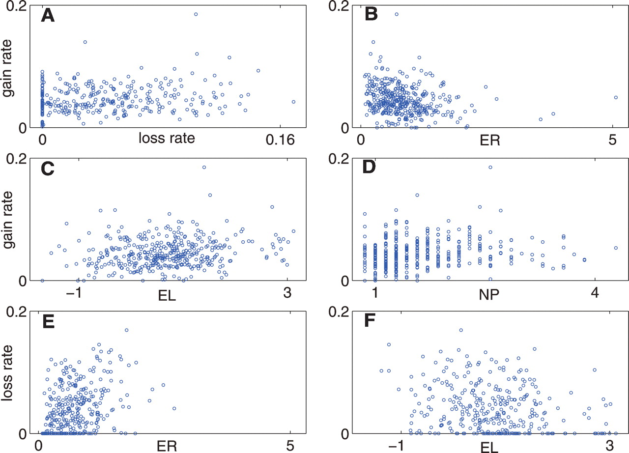 Scatter plots of the gene-specific intron gain and loss rates versus other genomic variables. (A) Intron gain rate vs. intron loss rate; (B) intron gain rate vs. gene evolution rate (ER); (C) intron gain rate vs. gene expression level (EL); (D) intron gain rate vs. number of paralogs (NP); (E) intron loss rate vs. gene evolution rate; (F) intron loss rate vs. gene expression level. Units of the variables: gain rate (arbitrary units); loss rate (arbitrary units); ER (average over a KOG of median normalized JTT distances); EL (maximum among paralogs of standardize log-values of expression readings); NP (average number of paralogs across seven eukaryotic species) (for details, see Wolf et al. 2006).