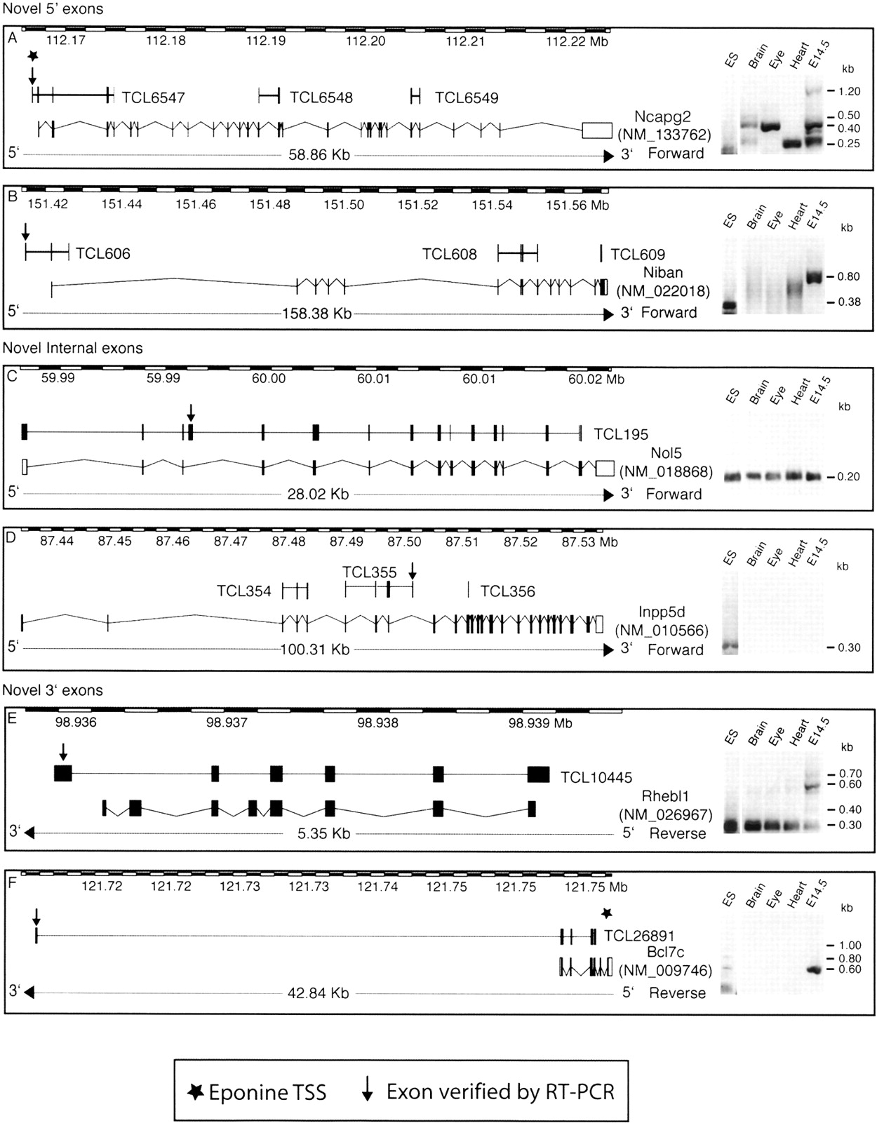 Discovery of novel exons on known RefSeq genes. The figure shows six examples of RefSeq genes to which novel exons (indicated by the arrow) were added using gene trap data, confirmed by RT-PCRs conducted on ES cell RNA as well as four other RNA samples shown in the panel on the right of each diagram. TCL6547 was verified as an alternative 5′-UTR exon of the Ncapg2 gene found to be expressed in all RNA samples tested, showing several splicing variants. The TCL606 cluster also confirms a new 5′-UTR exon (belonging to the Niban gene); however, its expression was only confirmed in ES cells and whole embryo (and not in heart, brain, or eye). The TCL195 cluster represents a novel alternatively spliced “cassette” exon added between exon 3 and exon 4 of the Nol5 gene, which is found to be expressed in all samples tested, always yielding the same PCR product. TCL355 adds an internal exon to the Inpp5d gene, and its sequence terminates at this exon. This cluster was found to be expressed only within ES cells. The TCL10445 cluster adds a 3′-exon to the Rhebl1 gene, and the transcript that includes this exon skips the last two constitutive exons of this gene in all RNA samples tested, while the isoform that includes the exons between is only found in whole embryo RNA. TCL26891 adds a further 3′-exon >30 kb away from the last exon of the Bcl7c gene. This exon is only found expressed in ES-cell RNA and whole embryo RNA.