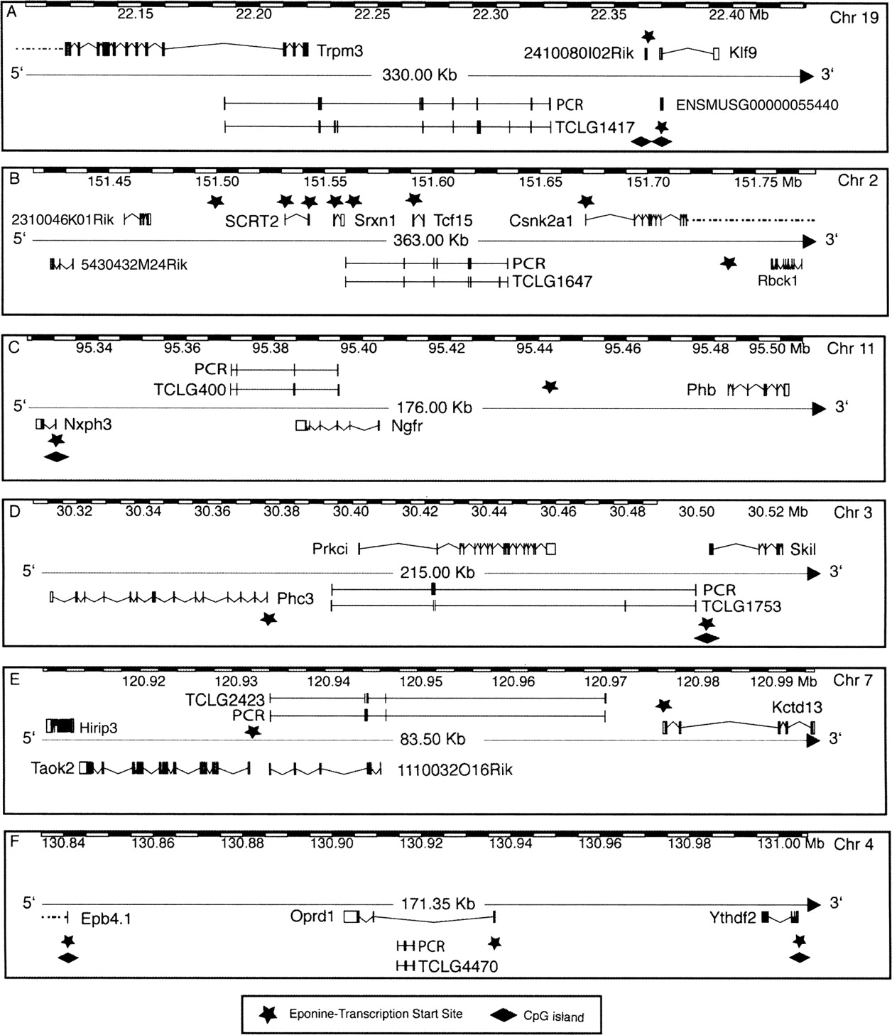 Discovery of novel genes based on trapclusters. The figure shows six examples of novel multiexon genes predicted using gene trap data verified by RT-PCR on ES-cell RNA as well as CpG island and Eponine transcription start site annotation. TCLG1417 is a transcript without an ORF found in reverse orientation and partial overlap with the Trpm3 gene with seven out of 10 predicted exons confirmed to be transcribed in ES cells (more expression info in Fig. 4). TCLG1647 is also found in opposite orientation to a known gene, Tcf15, but it is actually larger and contains the known gene within its intron. This trapcluster gene was predicted to contain seven exons, but PCR verification resulted in the merge of two proximal exons, the addition of a novel exon that was not present in the gene trap collection, and two exons that could not be linked to this transcript. TCLG400 is also opposite and in partial overlap to a known gene, Ngfr, and all its four exons were confirmed by RT-PCR. Only three out of five exons of TCLG1753 were connected in a single, large transcript that contains the Prkci gene on the opposite strand. TCLG2423 is found opposite to the 1110032O16Rik gene, and all its four exons were confirmed by RT-PCR. TCLG4470 is a compact three-exon transcript found opposite and nested to the Oprd1 gene, confirmed by RT-PCR.