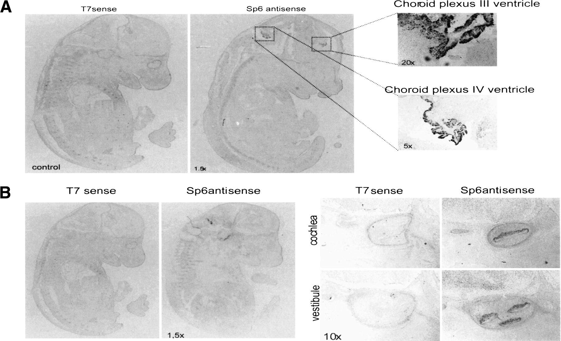 In situ hybridization of trapcluster gene TCLG1417 on E14.5 mouse embryo. The figure shows the in situ hybridization of trapcluster gene TCLG1417 on a mouse embryo at the E14.5 developmental stage. This gene shows a highly specific signal. (A) The signal detected within the choroids plexus at 1.5×, 5×, and 20× magnifications. (B) The signal within the developing auditory and vestibular pathways, specifically the developing cochlea and vestibule at 1.5× and 10× magnification.