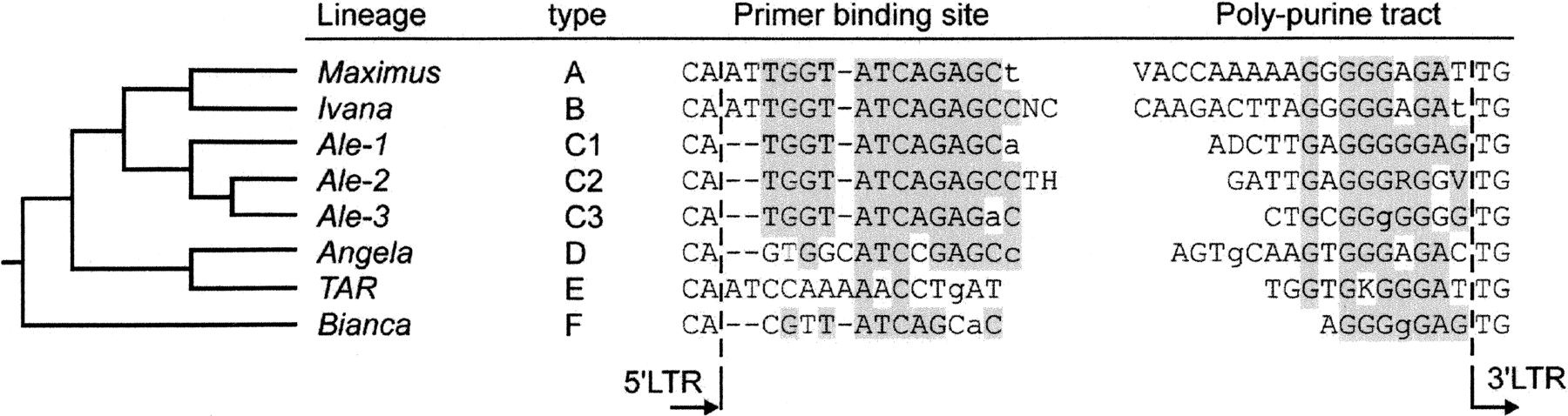 Comparison of primer binding sites (PBS) and polypurine tracts (PPT) of the six evolutionary copia lineages. The tree diagram at the left illustrates the relationship between the six evolutionary lineages as determined through the phylogenetic analysis shown in Figure 1.The terminal two bases at the 5′ end of PBS and at the 3′ end of PPT belong to the 5′ and 3′ LTRs, respectively. Shown are consensus sequences for five main lineages as well as the Ale lineage, which is split into three sublineages due to strong divergence within the Ale lineage. Each PBS/PPT pair is given a “type” index that corresponds to the one in Figure 1. The full-sequences alignments are available as Supplemental Figure 2.