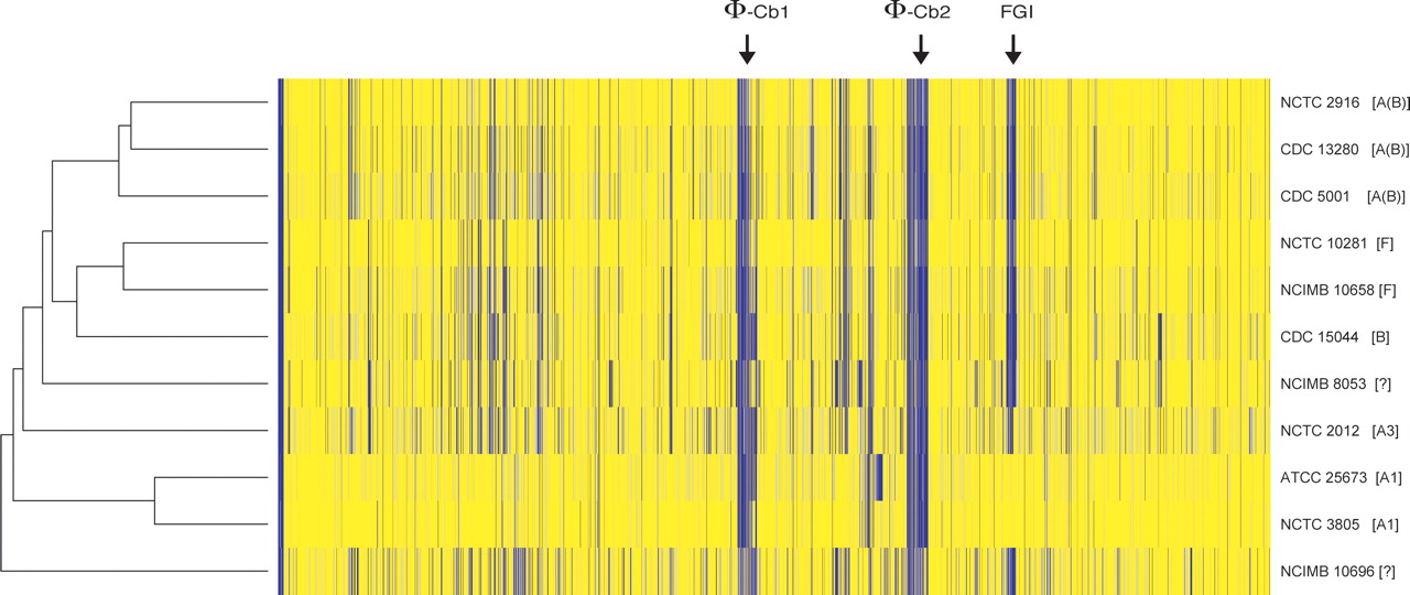 Comparative genomic analysis of strains of proteolytic C. botulinum and C. sporogenes strains using microarrays. Horizontal colored bars indicate array competitive hybridization. Vertical lines represent CDS present (yellow lines), absent or highly diverged (blue lines), and uncertain (gray lines). The plasmid CDS are on the left, followed immediately by the first gene in the chromosome (CBO001), and the last chromosomal CDS (CBO3650) is on the right. For strains of proteolytic C. botulinum, the toxin types are included in square brackets; two strains of C. sporogenes (NCIMB 8053 and NCIMB 10696) are also included. The position of the two prophages (Φ-Cb1 and Φ-Cb2) and the potential flagellin glycosylation island (FGI) are indicated by arrows.