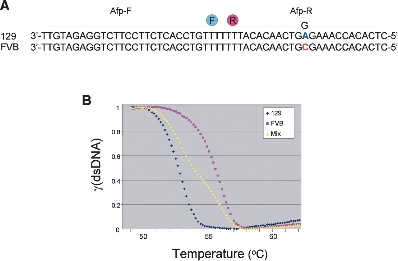 Characteristic melting curves distinguish DNAs differing at only a single base pair. (A) FRET probes Afp-F and Afp-R are labeled with fluorescein and with Red640, respectively. The SNP distinguishing 129 and FVB alleles is highlighted with bold type. (B) The melting of FRET probe Afp-R from mouse Afp cDNAs derived from 129 mice (blue diamonds), FVB mice (purple squares), or from a 1:1 volume mixture of 129 and FVB cDNAs (yellow triangles). DNA melting is assayed by loss of fluorescence at 640 nm and then normalized as described in the text so that the Y-axis reflects the relative fraction of remaining dsDNA [γ(dsDNA)]. Note the leftward shift of the 129 cDNA melting, consistent with its single base-pair mismatch of probe Afp-R.