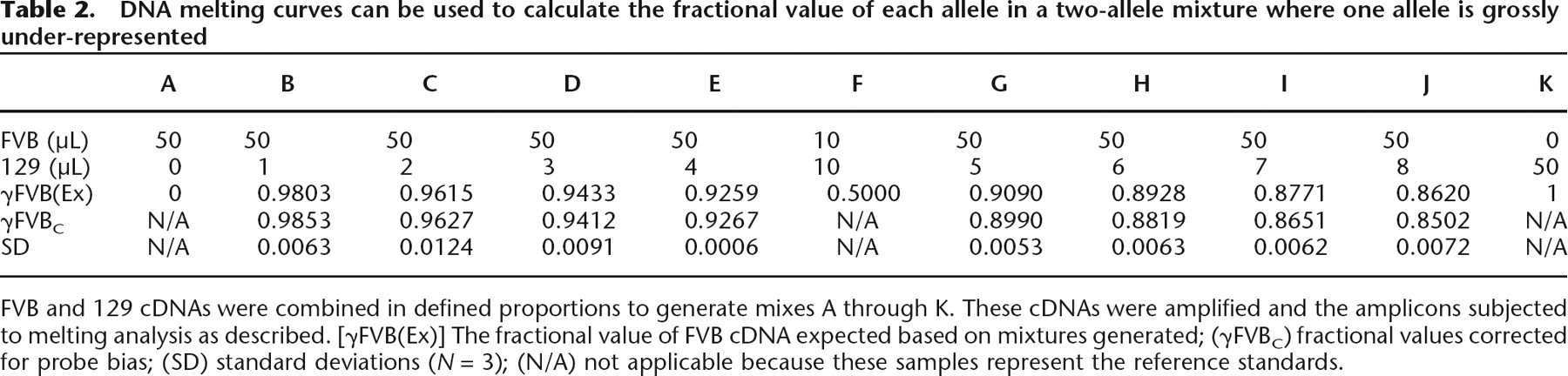 FVB and 129 cDNAs were combined in defined proportions to generate mixes A through K. These cDNAs were amplified and the amplicons subjected to melting analysis as described. [γFVB(Ex)] The fractional value of FVB cDNA expected based on mixtures generated; (γFVBC) fractional values corrected for probe bias; (SD) standard deviations (N = 3); (N/A) not applicable because these samples represent the reference standards.