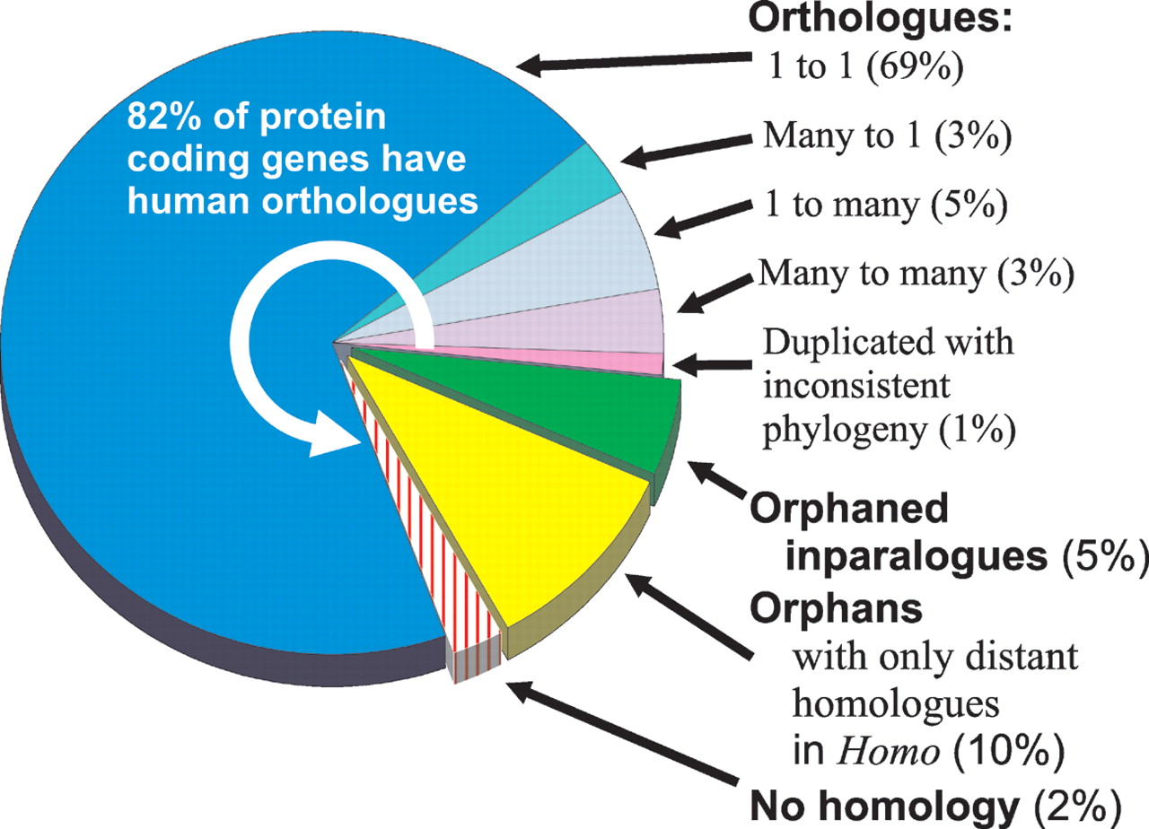 Proportion of Monodelphis domestica genes with Homo orthologs. The majority (82%) of protein coding genes have PhyOP-predicted orthologs among human genes. The classes of orthology relationships are indicated by counts of Homo orthologs followed by Monodelphis. Thus, a one-to-many relationship refers to a single Homo gene that is orthologous to several Monodelphis-specific duplications. Many of the genes with no predicted orthology with a Homo gene are nevertheless closely related to one or more Monodelphis genes with a low dS, indicating that these are Monodelphis-specific duplications. These are labeled as “Orphaned inparalogues.” This class includes genuine biological losses in the eutherian or human lineage, as well as heuristic failures in the PhyOP-prediction pipeline. The latter are often related to errors in gene predictions in difficult cases where there are many adjacent tandem duplications, such as among KRAB-ZnF genes. Similarly, many of the Monodelphis genes which have no plausible candidate ortholog in the human genome (labeled “Orphans with only distant homologues in Homo”) are likely to involve problematic gene predictions. The Monodelphis genes in the “No homology” class do not have significant BLAST alignments (E < 10−5) covering the majority of the sequence (75% of the shorter of the pair of sequences, and involving more than 50 residues). Most of these appear to be fragmentary, chimeric, or erroneous gene predictions, or noncoding sequence.
