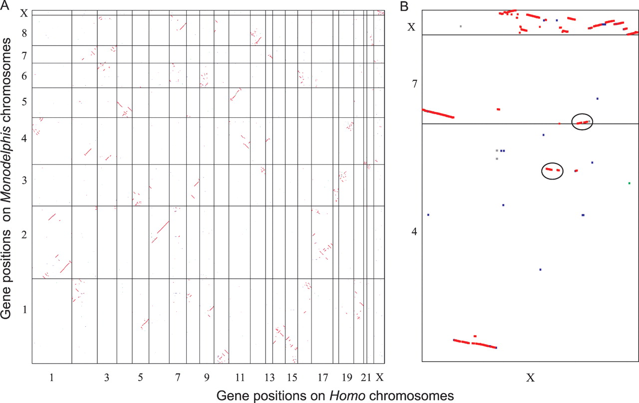 Oxford Grid (Edwards 1991) of PhyOP orthologs showing Homo–Monodelphis synteny blocks. (A) Genomic Synteny for all Monodelphis and Homo chromosomes. Genes are plotted in consecutive gene order along the Monodelphis chromosomes MDO1-8 and MDOX, and along the Homo chromosomes HSA1-22 and HSAX. One-to-one, one-to-many, many-to-one, and many-to-many Homo-to-Monodelphis orthologs are displayed as red, green, blue, and black dots, respectively. Diagonal lines represent genomic segments with conserved synteny. (B) The syntenic relationships for the ancient region of the Homo X chromosome that is syntenic to the Monodelphis X chromosome, and the more recently derived regions on the short arm of HSAX that are syntenic to MDO4 and MOD7. The circled regions have been placed on MDO4 and MDO7 in the current Monodelphis assembly 3, but FISH analyses map these regions to the Xq arm of MDOX (M. Breen and P. Water, pers. comm.).