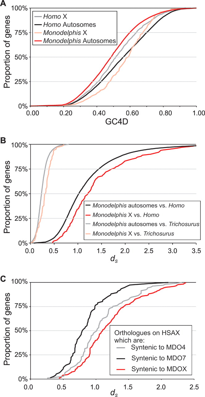 G+C Content at 4D sites (GC4D) and dS in the Monodelphis and Homo X chromosomes. (A) GC4D values of Monodelphis genes in 1:1 orthology relationships with Homo genes. The cumulative distribution of GC4D for orthologs on the Monodelphis X chromosome is shifted to higher values compared with that for orthologs on Monodelphis autosomes, and genes on the Monodelphis X chromosome have a much increased median GC4D. This is exactly the opposite of the situation among Homo orthologs, where X chromosome genes have reduced GC4D. (B) The increased GC4D on the Monodelphis X chromosome is accompanied by an increase in median dS and a rightward shift of the dS cumulative distribution. This effect is even more pronounced when comparing orthologs between Monodelphis and Trichosurus, suggesting that much of the increase in dS has taken place along the marsupial lineage. (C) The dS for Homo–Monodelphis orthologs that lie on the Homo X chromosome and that are syntenic to the Monodelphis chromosome X or to chromosomes 4 and 7. Among orthologs on the Homo X chromosome, only those that are also found on the Monodelphis X chromosome have elevated dS, confirming that this is largely a marsupial-specific phenomenon.