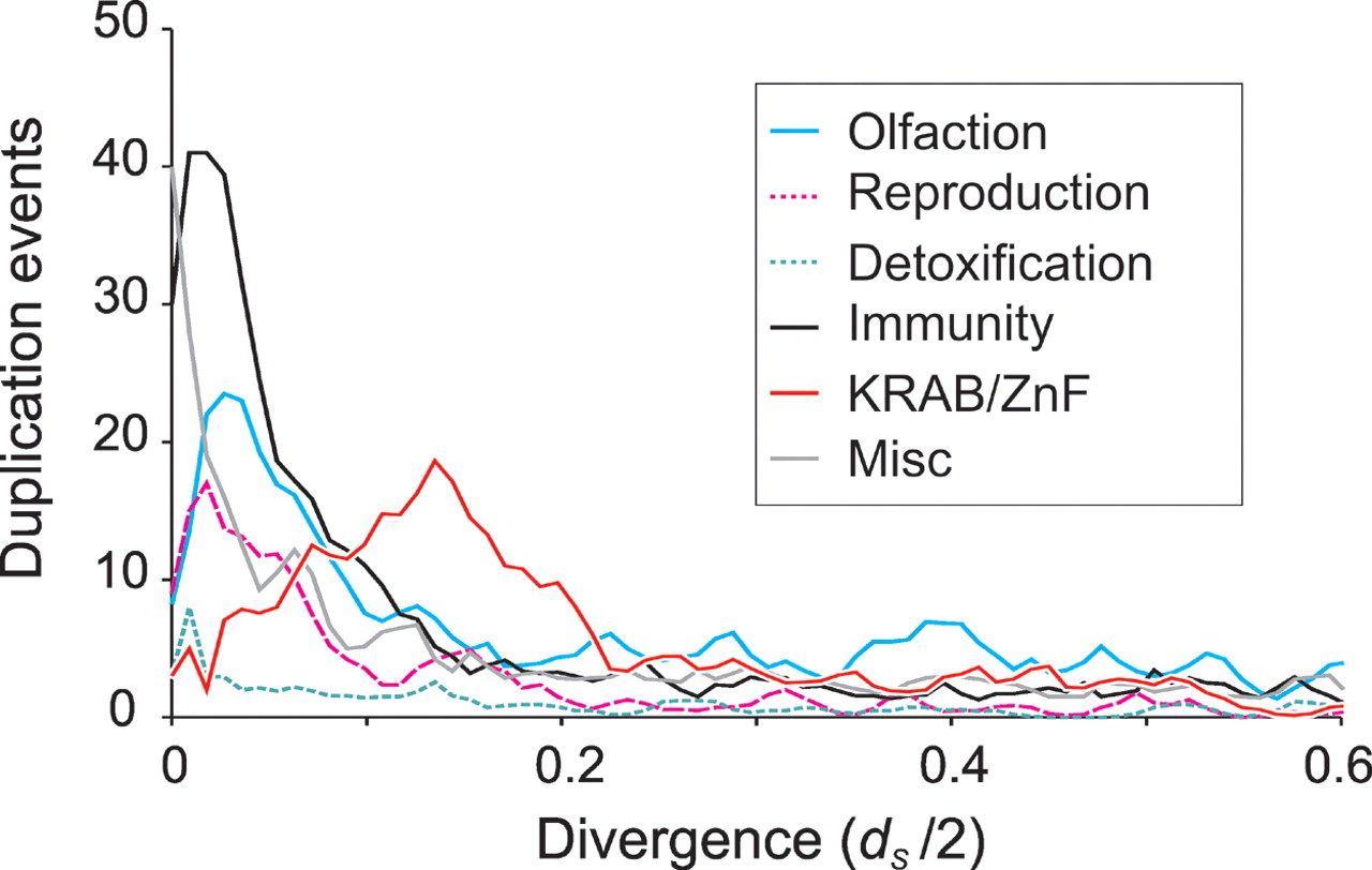 Inferred rates of duplication for Monodelphis inparalogs among different functional categories. The timing of duplication events for Monodelphis-specific inparalogs were inferred from the dS-based rooted phylogenetic tree, and thus appears on a scale of dS/2 units. Although dS values vary substantially among genes (Fig. 3B), on average, a dS/2 value of 0.25 represents ∼90 million years. Genes in most functional classes (including olfaction, reproduction, detoxification, and immunity) follow a profile typical of other mammals with duplications peaking very recently. This would be in accordance with a rapid gene birth and death model. It is likely that reduction in the number of most recent duplications (dS/2 < 0.02) is due partly to the collapse of nearly identical sequence in the assembly, and partly to underprediction of sequence-similar adjacent paralogs and overestimation of very small dS values. The duplications of KRAB-ZnF genes are prominent in peaking at dS/2 ∼ 0.14.