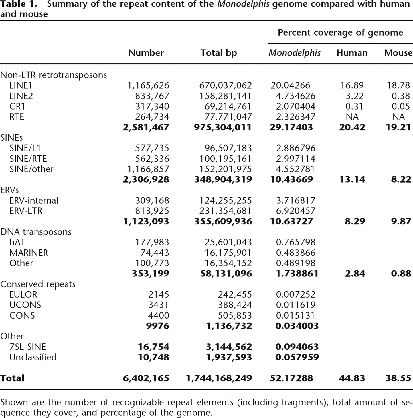 Summary of the repeat content of the Monodelphis genome compared with human and mouse