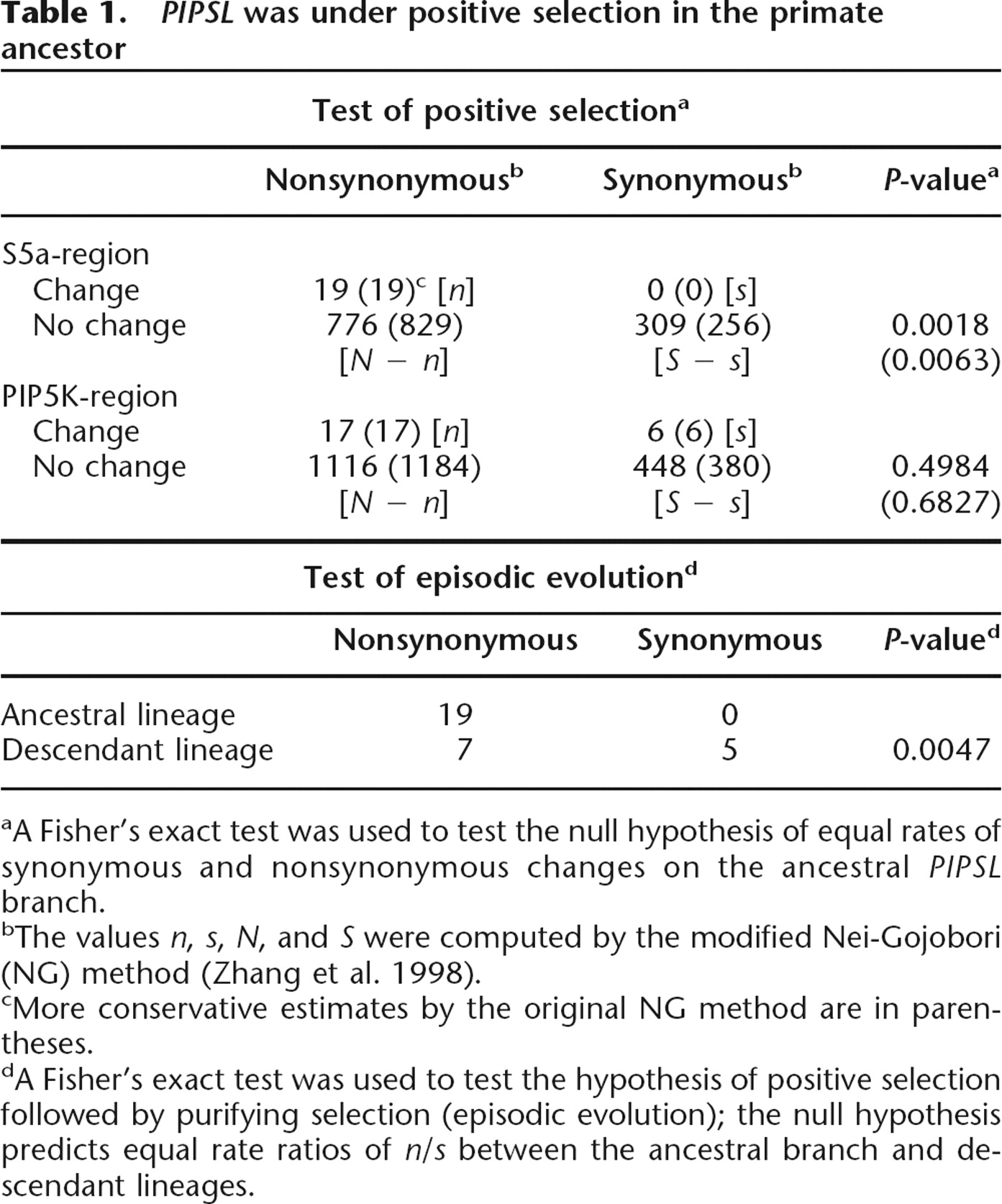 aA Fisher’s exact test was used to test the null hypothesis of equal rates of synonymous and nonsynonymous changes on the ancestral PIPSL branch.