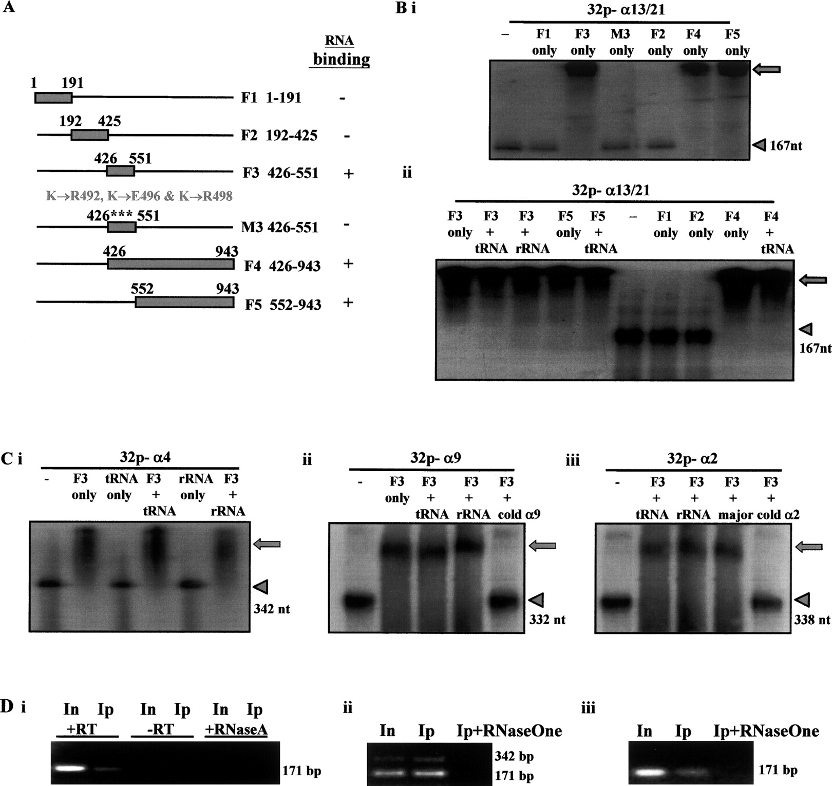 RNA-binding properties of CENPC1 and the kinetochore. (A) Schematic representation of the different recombinant GST-CENPC1 constructs. (F1–F5) GST-CENPC1 recombinant fragments corresponding to amino acids 1–191, 192–425, 426–551, 426–943, and 552–943, respectively; (M3) a GST-CENPC1 recombinant fragment corresponding to F3426–551 but containing three mutational substitutions: K492 → R492, K496 → E496, and K498 → R498. Plus and minus signs indicate positive and negative α-satellite RNA binding, respectively (see B). (B) RNA binding assay. (i) Direct incubation of 0.25 μg of radioactively labeled single-stranded α13/21-satellite RNA probes (167 nt in size) with recombinant GST-CENPC1 fragments resulted in a band shift of the labeled RNA (arrowhead) away from its expected position to a significantly larger size (arrow) for fragments F3, F4, and F5 (but not F1, F2, and M3), indicating a positive RNA-binding property for fragments F3, F4, and F5. (ii) The addition of 2 μg of tRNA or rRNA as a competitor has no significant effects on the binding of these proteins to the labeled α-satellite RNA probes. (C) Direct incubation of 0.25 μg of radioactively labeled single-stranded α4 (Ci), α9 (Cii), and α2 (Ciii) satellite RNA probes (342, 332, and 338 nt in size, respectively) with recombinant GST-CENPC1 fragment F3 resulted in a band shift of the labeled RNA (arrowhead) away from its expected position to a significantly larger size (arrow). The addition of 2 μg of tRNA, rRNA, and AT-rich mouse pericentric major satellite as a competitor has no significant effects on the binding of these proteins to the labeled α-satellite RNA probes. However, the addition of 2 μg of cold α9 (Cii) and α2 (Ciii) resulted in loss of band shift. (D) Detection of CENPC1-associated RNA following CENPC1-mediated RNA-ChIP. α-Satellite PCR primers used were specific for chromosome 13/21 (i,ii) or chromosome 4 (iii). RNA was detected as a 171-bp cDNA band (corresponding to an α-satellite monomer) using RT-PCR in the CENPC1-mediated RNA-ChIP sample (Ip) and in the total genomic input DNA (In). In some experiments where the number of PCR cycle was increased from 25 to 30, a 171-bp ladder could be seen (e.g., ii). The absence of products when no reverse transcriptase was added (−RT) or following pretreatment of samples with either RNaseA or RNaseOne for 10 min at room temperature indicated that the RT-PCR products were derived from immunoprecipitated RNA, and not DNA.