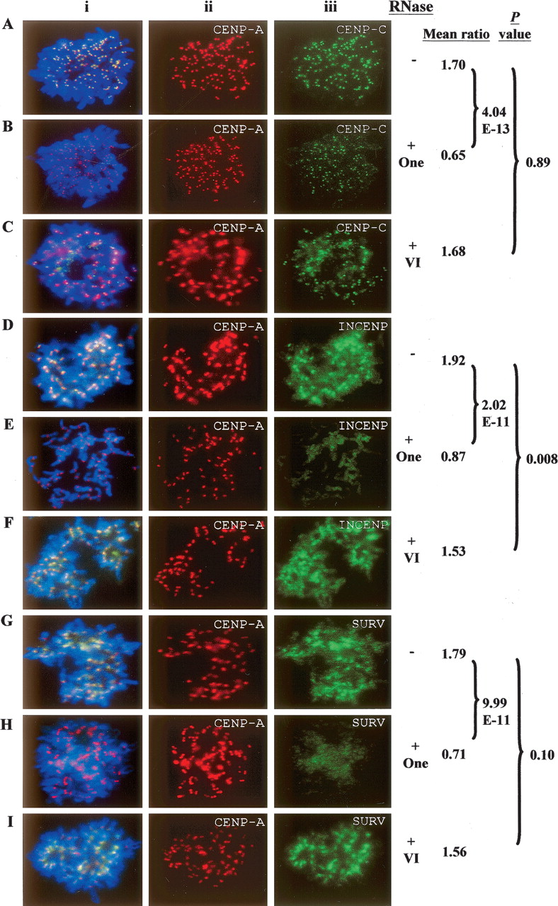 Effect of single-stranded RNA-specific RNaseOne and double-stranded RNA-specific RNaseVI treatment on the localization of centromere proteins on HeLa metaphase chromosomes. The comparison of the immunofluorescence signals for 25 cells with (+) and without (−) RNaseOne treatments by scoring the signal intensities on five chromosomes for each cell. Each data set was normalized against the CENPA signal (Aiii–Iii; red) and expressed as “mean ratio.” RNase A treatment led to a significant reduction (P-value < 0.001) for immunofluorescence intensities for CENPC1 (Aiii,Biii; green), INCENP (Diii,Eiii; green), and survivin (SURV) (Giii,Hiii; green). As with the RNase or RNaseA treatment shown in Figs. 4 and 5, signal reduction on the centromeres was less complete for CENPC1 compared with CENPA, INCENP, and survivin. Similar pairwise comparisons indicated no significant difference in mean immunofluorescence signals before and after RNaseVI treatment for CENPC1 (Aiii,Ciii; green), INCENP (Diii,Fiii; green), and survivin (SURV) (Giii,Iiii; green). (i) Merged images of ii and iii.