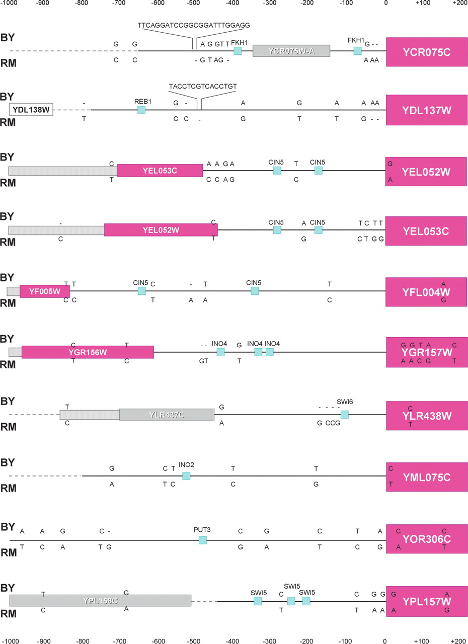 Physical map of 10 promoter regions of the BY and RM strains. The SNP positions of BY and RM were labeled; a dash denotes the absence of nucleotide. Black lines and pink boxes denote the swapped promoter region and the coding region, respectively. Gray boxes denote putative (uncharacterized) genes. Dotted line and checker denote the unswapped intergenic region and the coding region, respectively. The blue cubes indicate the TFs binding site quoted from the SGD database with the data of Harbison et al. (2004).