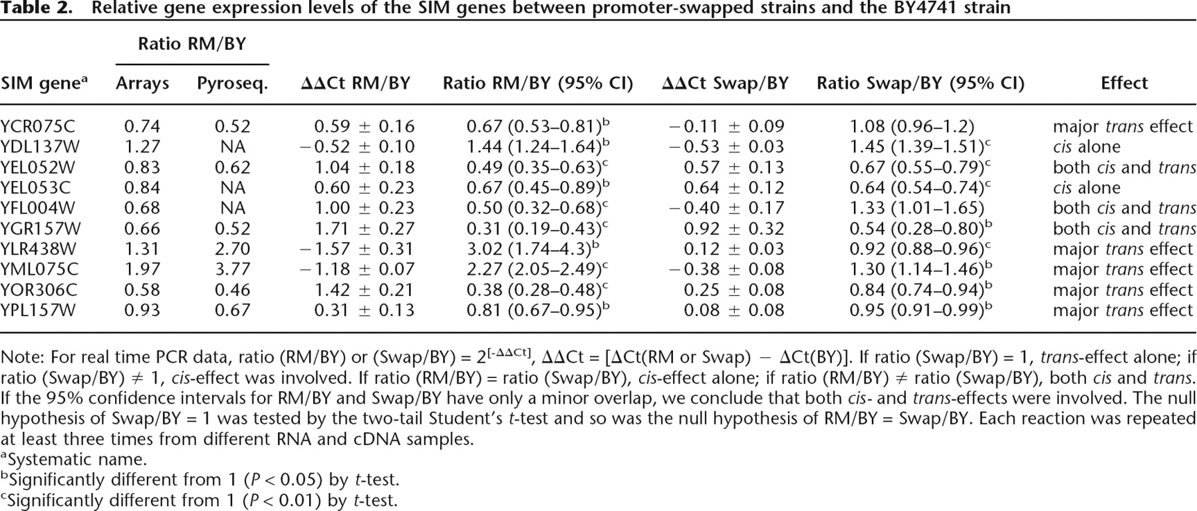 Note: For real time PCR data, ratio (RM/BY) or (Swap/BY) = 2[-ΔΔCt], ΔΔCt = [ΔCt(RM or Swap) − ΔCt(BY)]. If ratio (Swap/BY) = 1, trans-effect alone; if ratio (Swap/BY) ≠ 1, cis-effect was involved. If ratio (RM/BY) = ratio (Swap/BY), cis-effect alone; if ratio (RM/BY) ≠ ratio (Swap/BY), both cis and trans. If the 95% confidence intervals for RM/BY and Swap/BY have only a minor overlap, we conclude that both cis- and trans-effects were involved. The null hypothesis of Swap/BY = 1 was tested by the two-tail Student’s t-test and so was the null hypothesis of RM/BY = Swap/BY. Each reaction was repeated at least three times from different RNA and cDNA samples.