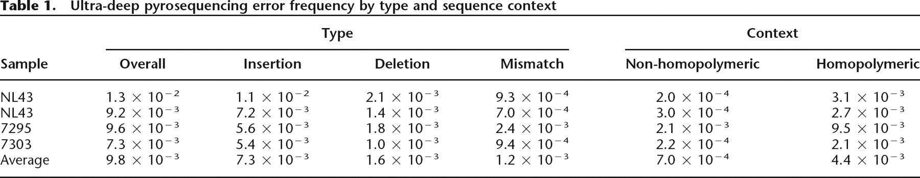 Ultra-deep pyrosequencing error frequency by type and sequence context