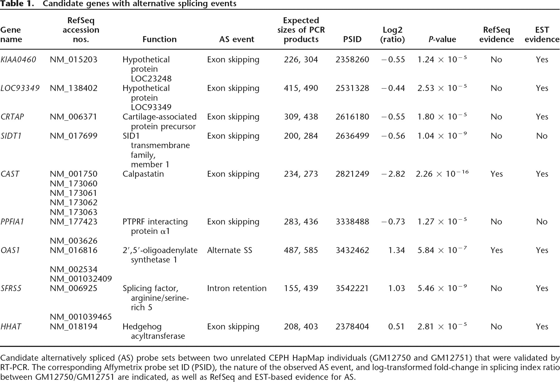 Candidate alternatively spliced (AS) probe sets between two unrelated CEPH HapMap individuals (GM12750 and GM12751) that were validated by RT-PCR. The corresponding Affymetrix probe set ID (PSID), the nature of the observed AS event, and log-transformed fold-change in splicing index ratio between GM12750/GM12751 are indicated, as well as RefSeq and EST-based evidence for AS.
