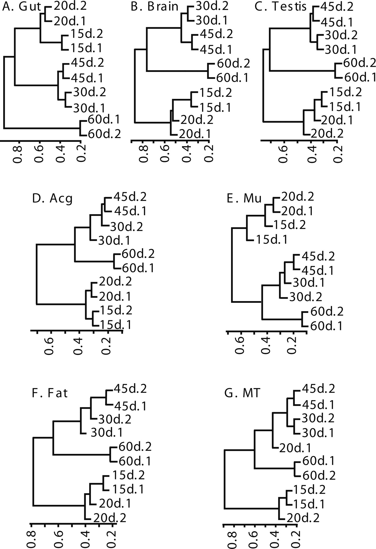 Hierarchical clustering analysis of temporal transcriptional profiles of individual tissues using the age-related genes. In each tissue, the difference of transcriptomic data at different ages is reflected by the distance scale bar shown at the bottom of each cluster dendrogram. Each branch represents one age-point labeled in the order of age, tissue type, and data set identification. (A) Gut; (B) brain; (C) testis; (D) Acg; (E) muscle; (F) fat; (G) MT.