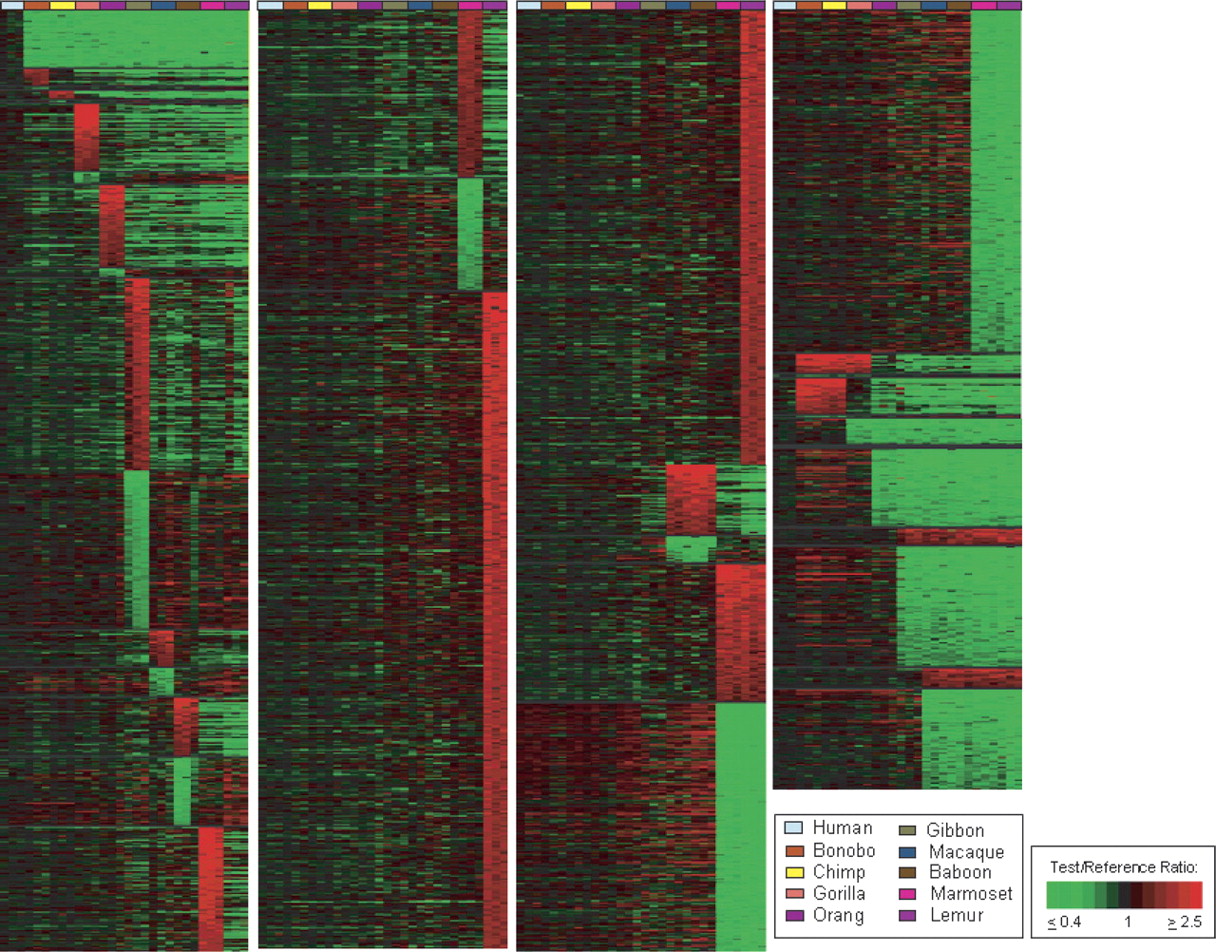 Treeview image of genes showing lineage-specific copy number changes among 10 primate species. Treeview image of 7318 genes giving LS aCGH signatures are shown for each of 10 lineages, including human (blue-gray), bonobo (rust), chimp (yellow), gorilla (orange), orangutan (purple), gibbon (green), macaque (blue), baboon (brown), marmoset (magenta), and lemur (light purple), as well as Old World Monkeys (OWM), marmoset and lemur, African Great Apes, Pan lineage (bonobo and chimp together), and combined aCGH-predicted changes relative to the remaining extended primates for the following groups: human and Pan lineage, human and African great apes, human and great apes, and human and all apes (great and lesser). The LS signals are grouped according to lineage and within each lineage are ordered, highest to lowest, according to the log2 fluorescence ratio of the signal intensity of test sample to reference sample. Colors are displayed using a pseudocolor scale as shown. The green signals indicate LS decreases with respect to human, and the red signals indicate LS increases with respect to human.