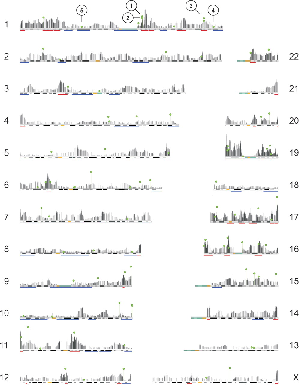 Physically mapped transcriptome profiles of all chromosomes, showing the integration sites and expression levels of all GFP constructs. Giemsa banding is illustrated below each transcriptome map: (yellow) centromere; (green) heterochromatic region; (red) ridges and (blue) anti-ridges are indicated by bars below the Giemsa banding. Black vertical bars represent genes (n = 20,382); their height indicates domain activity for a window of 49 genes (median expression of the surrounding 49 genes in 133 pooled SAGE libraries). Green lollipops indicate integration sites of all GFP constructs (n = 90). The height of each lollipop corresponds to the expression level of the integrated GFP construct. The numbered clones on Chromosome 1 were used for 3D-FISH analysis (see Fig. 6).
