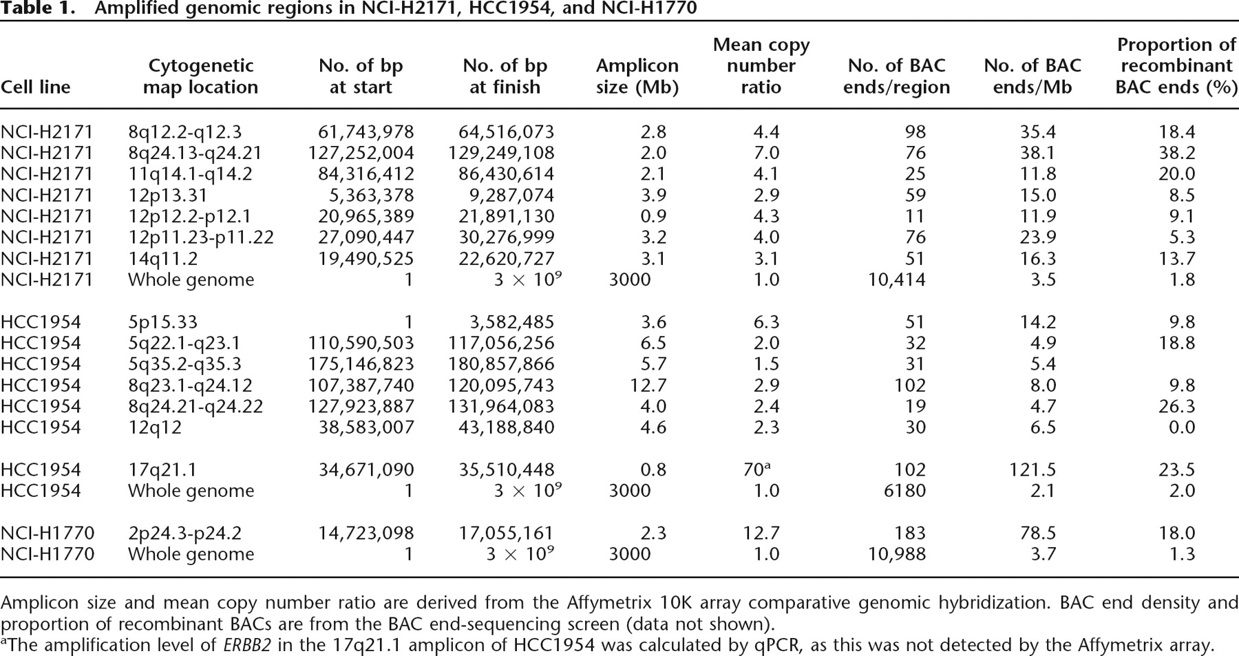 Amplified genomic regions in NCI-H2171, HCC1954, and NCI-H1770