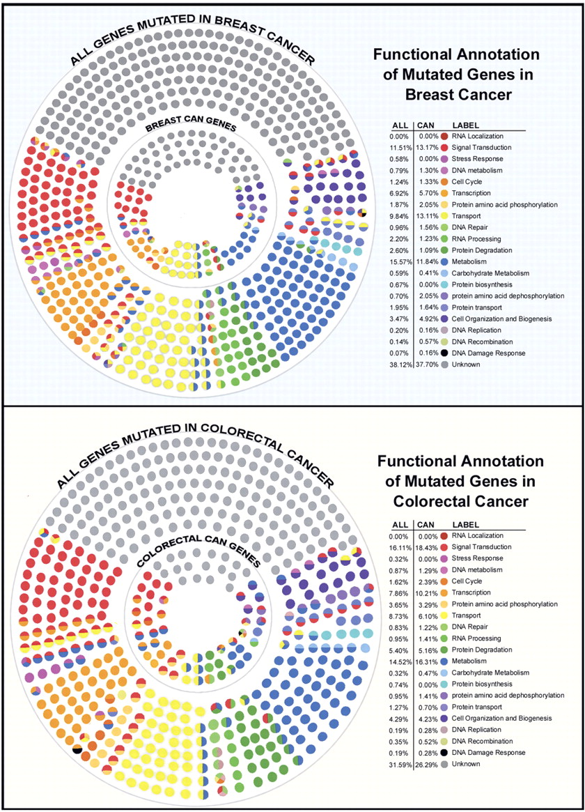 General functional categorization of genes mutated in breast and colorectal cancers. Each small circle represents a mutated gene in breast or colorectal cancer and is colored according to the general functional categories shown in the legend (for details, see Methods). The entire set of circles represents all the genes mutated in each cancer type, while the interior subset is comprised of the genes with the highest CaMP Scores (the CAN-genes). The percentage of genes that belong to each functional category is shown in the legend.