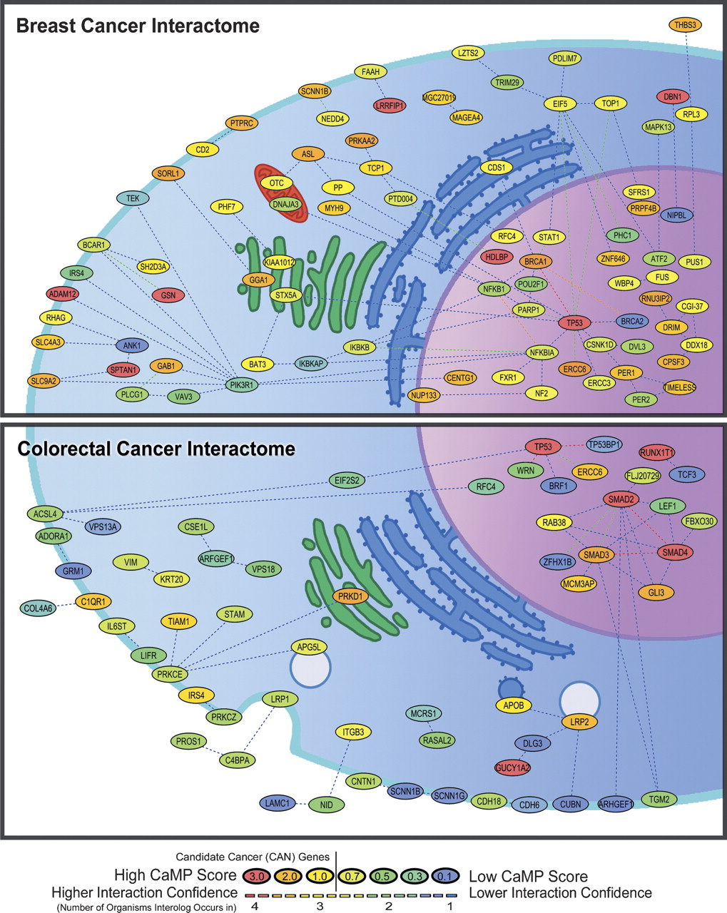 Interaction among proteins mutated in breast and colorectal cancers. Each node represents a mutated protein that is colored according to Cancer Mutation Prevalence (CaMP) Score, and each line represents an interaction confidence. CAN-genes identified by Sjöblom et al. (2006) have a CaMP score >1 and are colored in orange and red. The genes are placed within cellular compartments as annotated in Gene Ontology.
