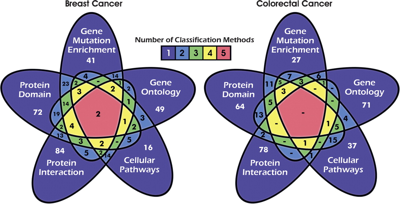 Comparison of genes annotated though different mutation enrichment classification methods. Five-way Venn diagrams (Grünbaum 1975) show the number of genes annotated through the indicated methods for breast and colorectal cancers. The “Gene Mutation Enrichment” set are the CAN-genes defined by Sjöblom et al. (2006). Each region indicates the number of genes that are detected by the different analytical methods, and is colored according to the number of methods that identify those genes. The genes detected by each classification method are listed in Supplemental Table 4, A and B.