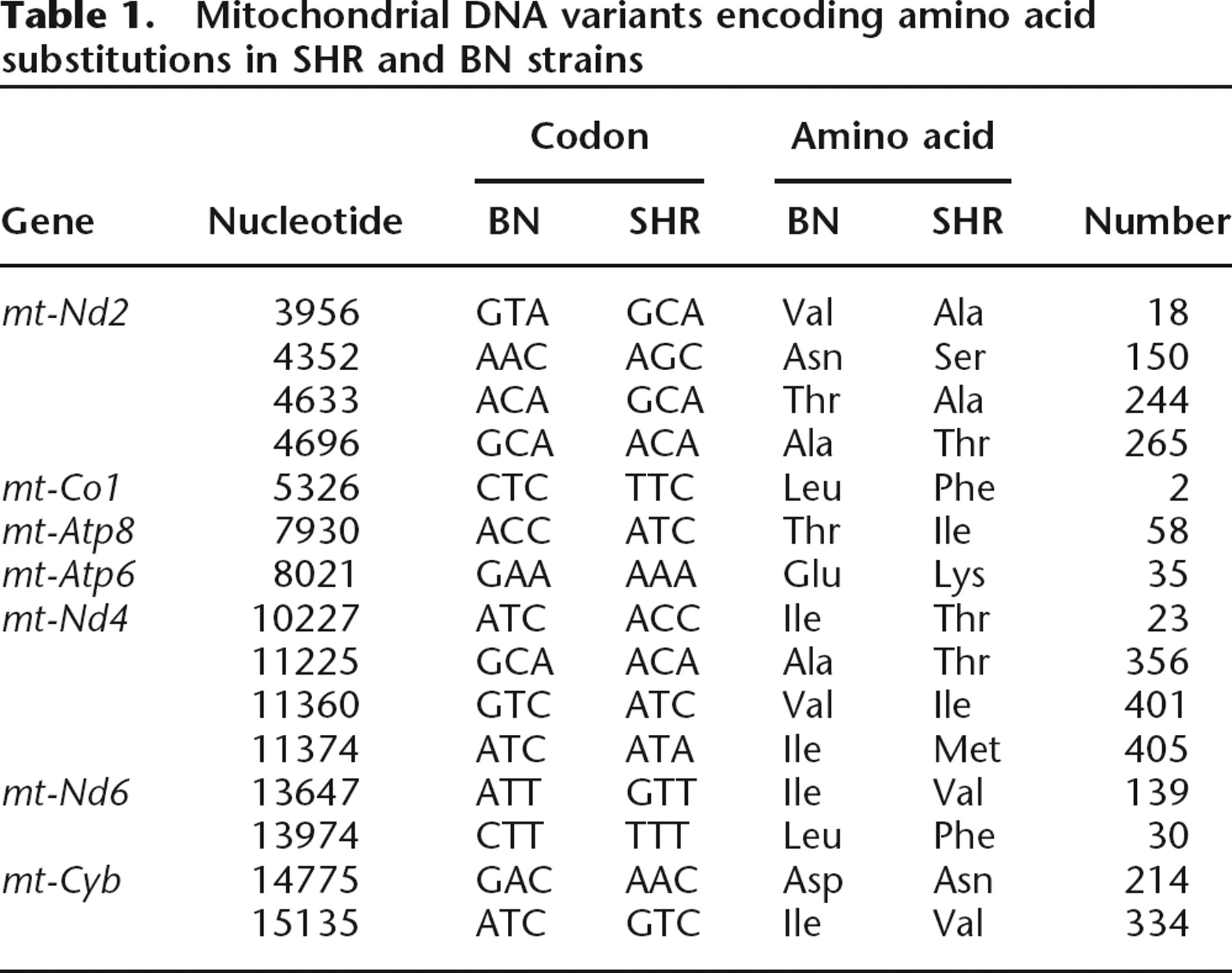 Mitochondrial DNA variants encoding amino acid substitutions in SHR and BN strains