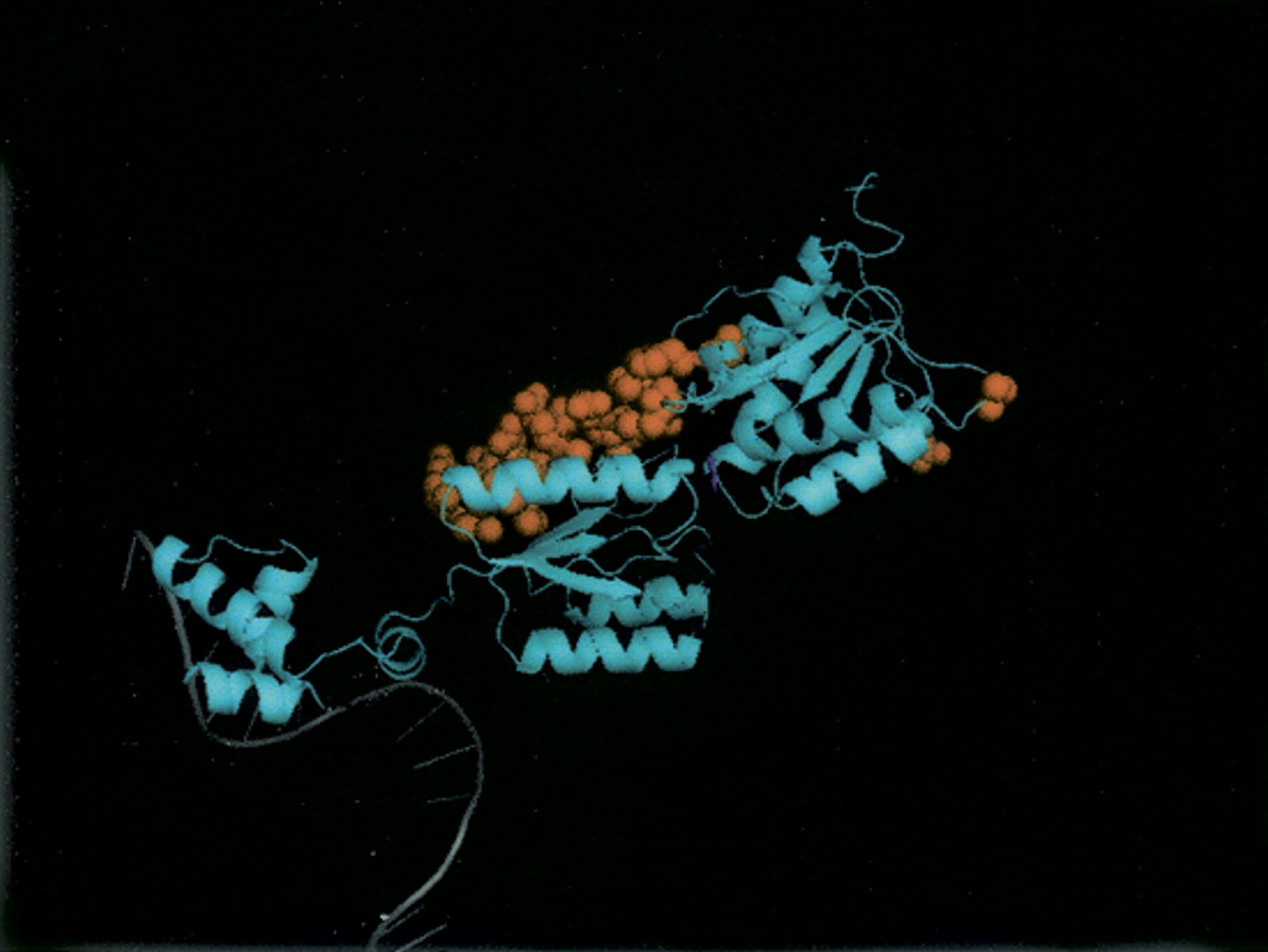 Three-dimensional structure of PurR. Sites that show evidence of positive selection (P < 0.01) are depicted as orange spheres. DNA strand is shown as gray ball-and-stick.