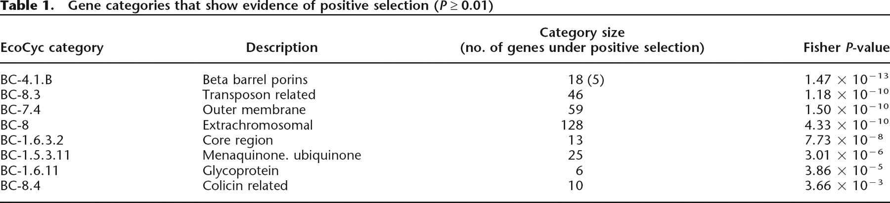 Gene categories that show evidence of positive selection (P ≥ 0.01)