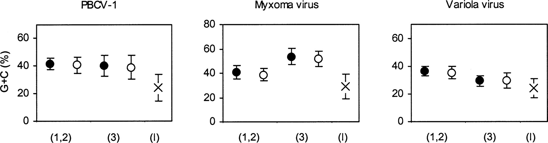 Average G+C compositions of WORFs (filled circles), NORFs (open circles), and intergenic sequences (crosses). For WORFs and NORFs, the G+C compositions at the first and second positions (1,2) and the third positions (3) are separately computed. Bars correspond to a standard deviation. For intergenic sequences, those ≥20 nt were analyzed.