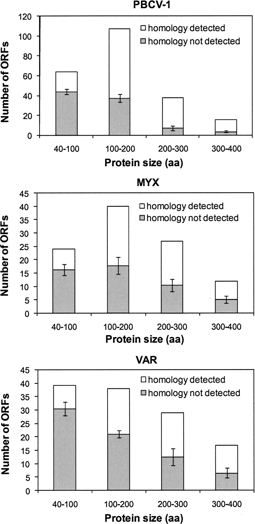 Homology search results for the simulated amino acid sequences that mimic the size distribution and low-complexity proportions of NORFs. Bars correspond to standard deviations obtained after 10 times simulations.