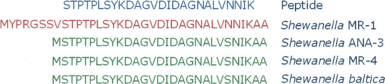 Sequence of phosphoribosylformylglycinamidine cyclo-ligase (SO_2760) in Shewanella oneidensis MR-1 according to TIGR annotation (red), observed nontryptic peptide (blue) and alignment to the orthologs in other Shewanella strains (green).