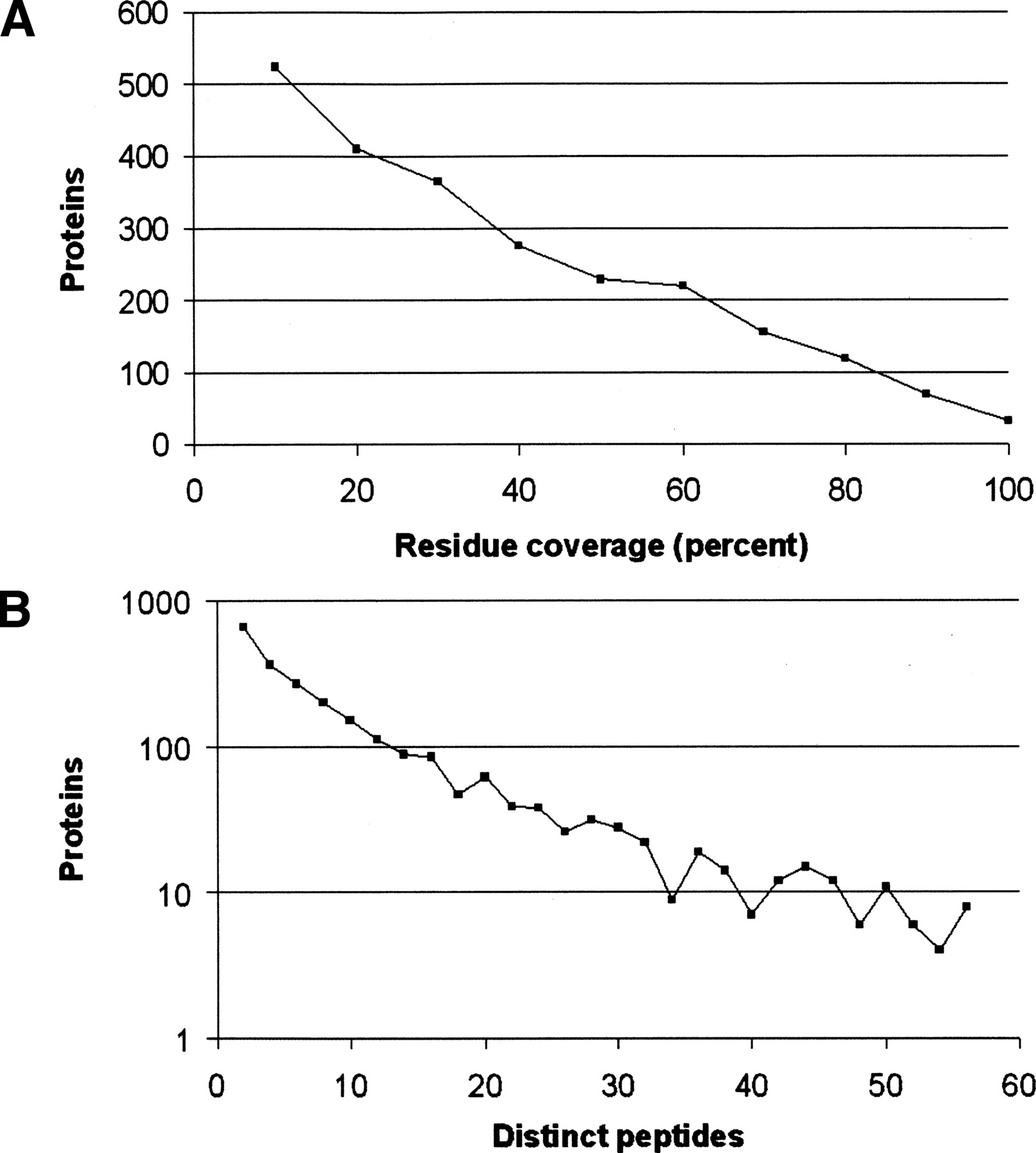 (A) Distribution of the number of identified peptides observed for TIGR genes. Protein counts are plotted on a logarithmic scale. (B) Distribution of the residue coverage of TIGR genes by identified peptides. A total of 102 genes had coverage of ≥90%. Genes were grouped into percentage bins of size 10 percentage points based on their coverage.