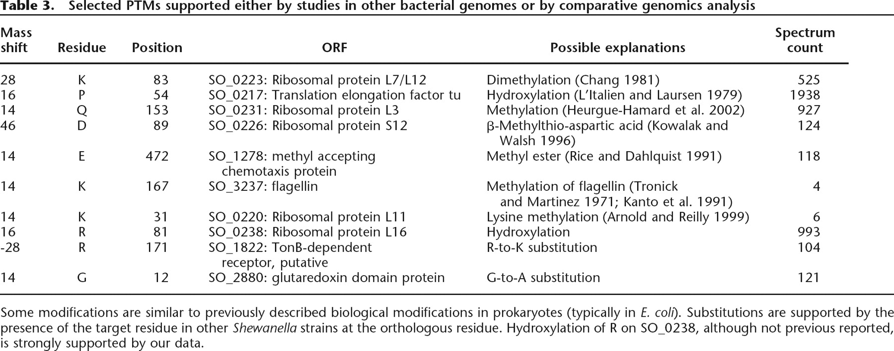 Some modifications are similar to previously described biological modifications in prokaryotes (typically in E. coli). Substitutions are supported by the presence of the target residue in other Shewanella strains at the orthologous residue. Hydroxylation of R on SO_0238, although not previous reported, is strongly supported by our data.