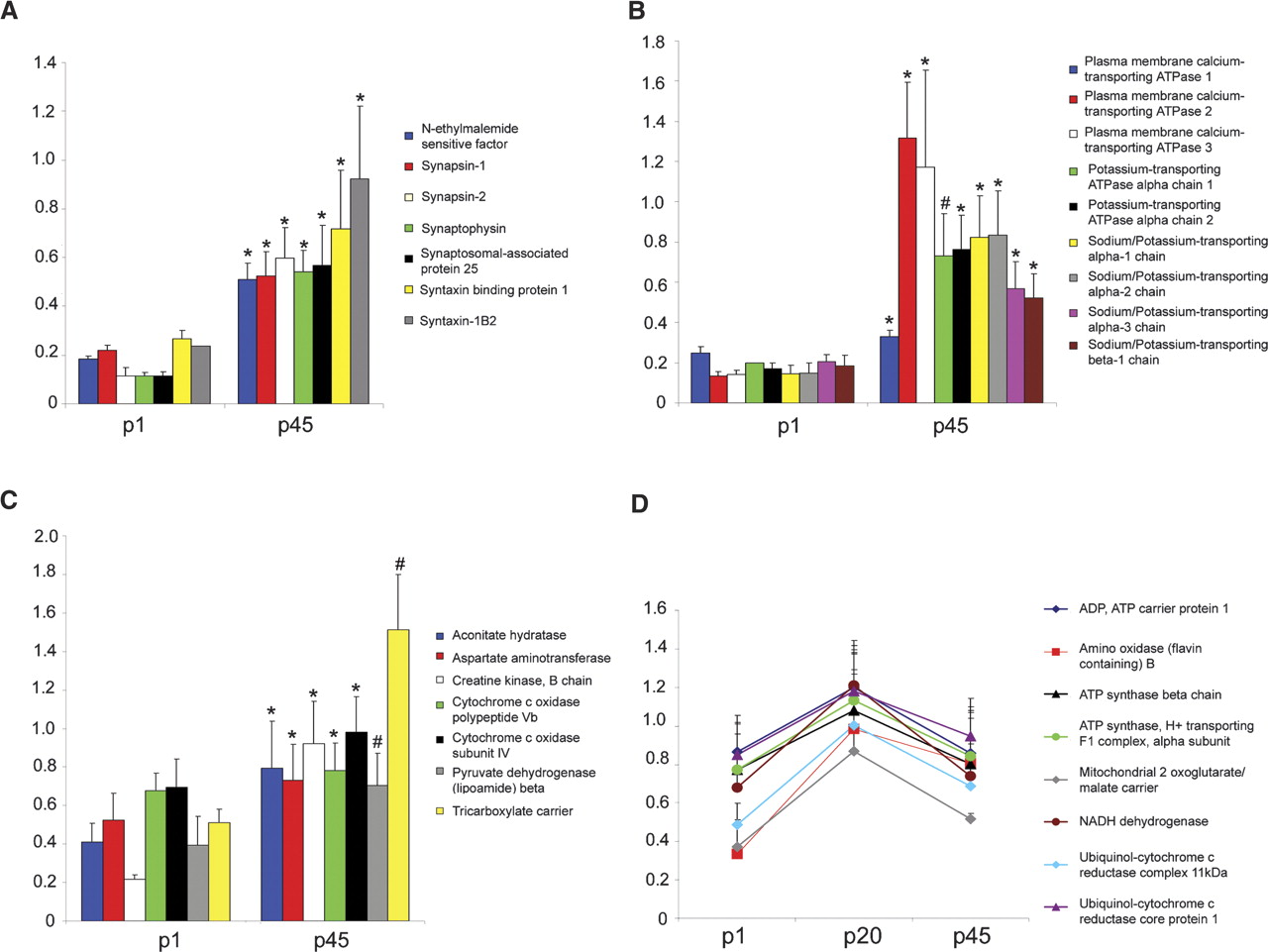 Altered expression of different classes of proteins during post-natal development. The expression of proteins essential for neurotransmission (A) and ATPases (B) significantly increased from p1 to p45. The expression of mitochondrial proteins exhibited two distinct trends in expression during post-natal development. The expression of some mitochondrial proteins significantly increased from p1 to p45 (C), while the expression of other mitochondrial proteins significantly increased from p1 to p20 but then the expression decreased dramatically (D). After the change in protein expression was determined significant in an ANOVA analysis, a Bonferroni post-hoc test was performed. The significant difference in 14N/15N ratios between p1 and p45 for the Bonferroni post-hoc test are represented for A, B, and C by * (P-value < 0.001) and # (P-value < 0.01). The significant difference in 14N/15N ratios between p1 and p20 for the Bonferroni post-hoc test in D are as follows: ADP, ATP carrier protein 1, ATP synthase beta chain, ATP synthase, H+ transporting, mitochondrial F1 complex, alpha subunit, isoform 1, NADH dehydrogenase, and Ubiquinol-cytochrome c reductase core protein I had P-values < 0.001, and Amine oxidase [flavin-containing] B, Mitochondrial 2-oxoglutarate/malate carrier protein, and Ubiquinol-cytochrome c reductase complex 11-kDa protein had P-values < 0.05. There was no significant difference detected for any of the proteins between the 14N/15N ratios between p1 and p45 in D. The Y-axis represents 14N/15N ratio.