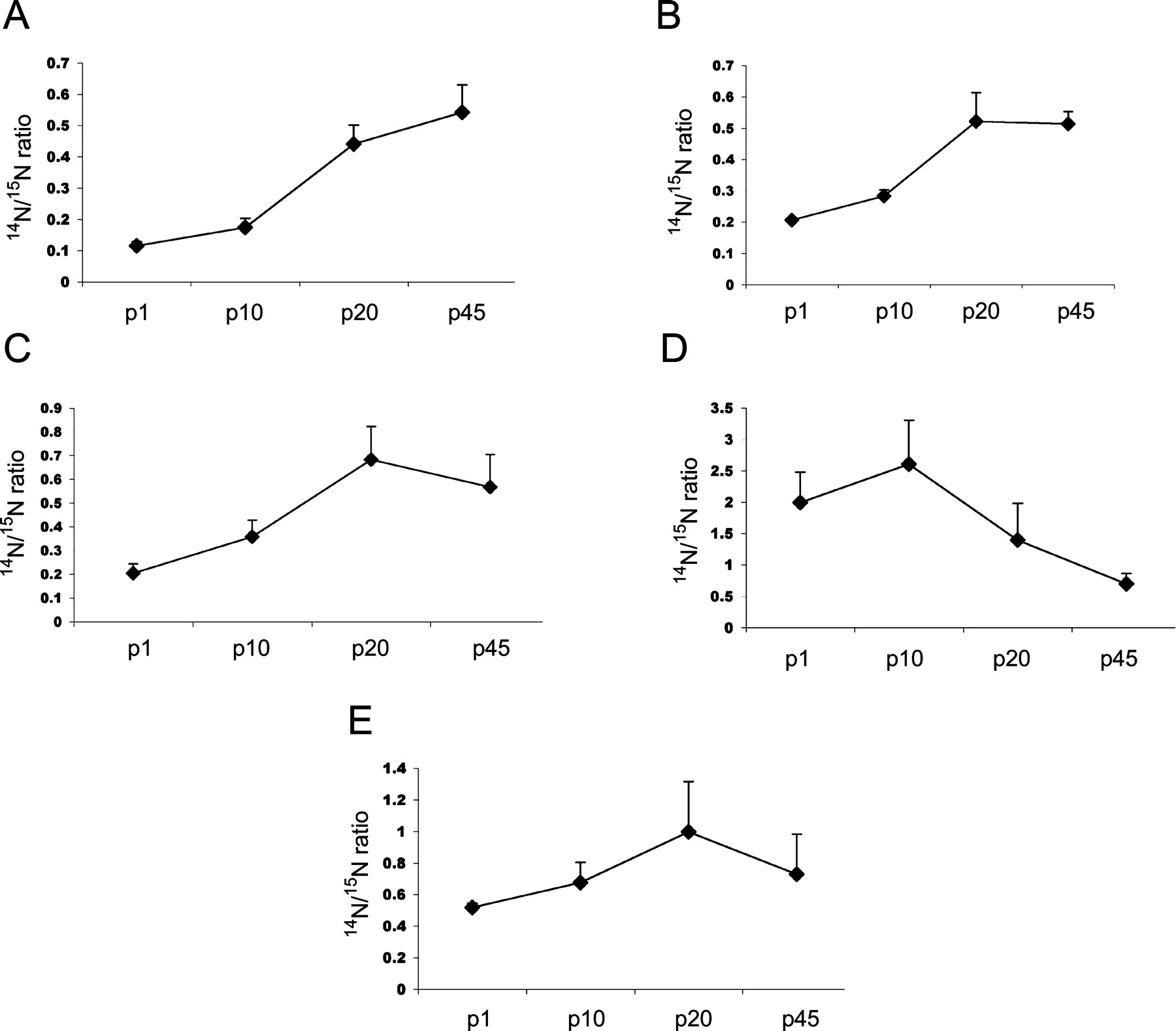 Time course of protein expression during post-natal development. We identified significant linear trends of synaptic proteins during four developmental time points. (A) synaptophysin (P < 0.0001, P-value of linear trend post-hoc test), (B) GluR2 (P < 0.0001), (C) Na+/K+ ATPase alpha-1 (P < 0.0001), (D) eEF1A1 (P < 0.0001), and (E) eEF1A2 (P < 0.0007).