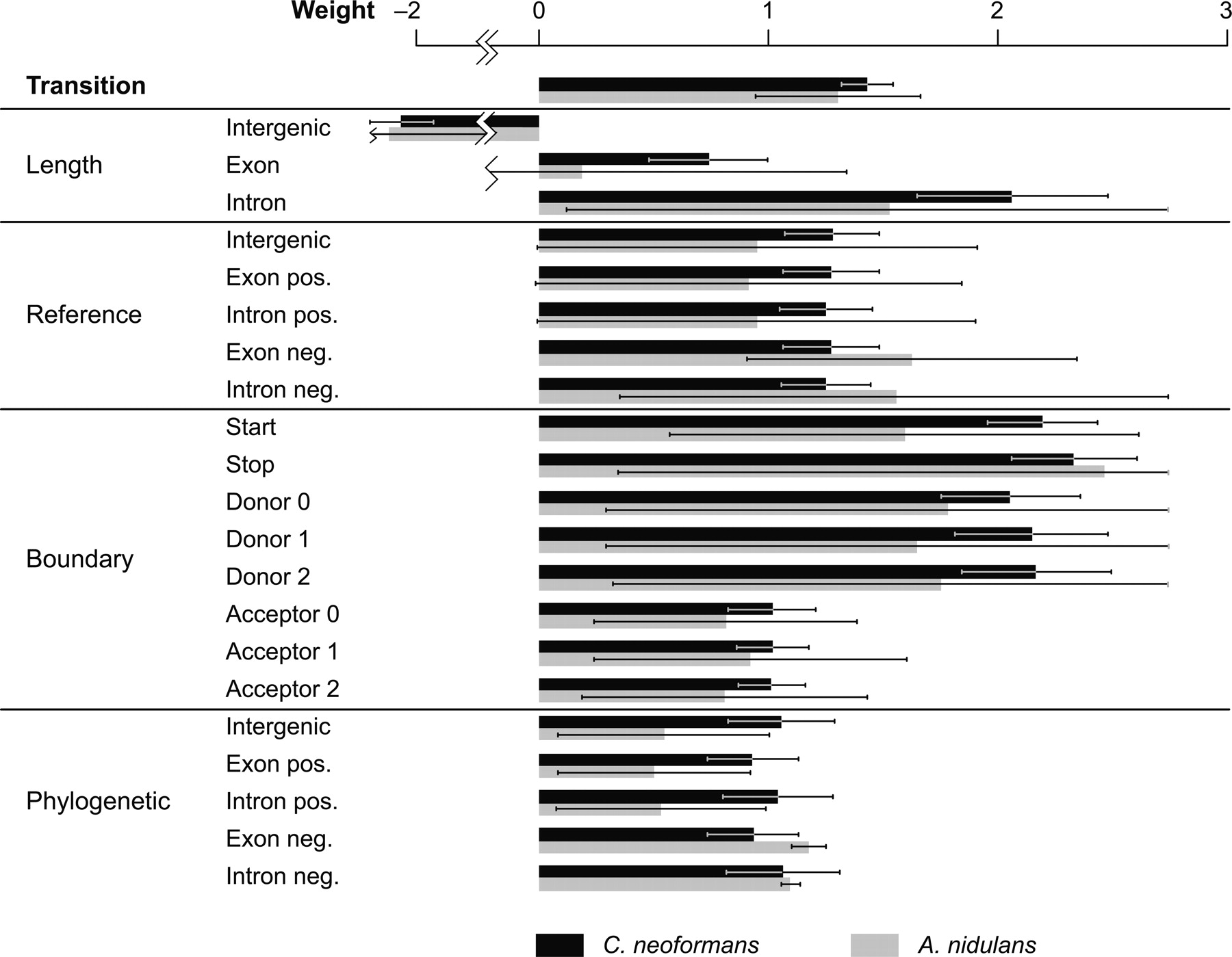 Average weights for the ConradS-2 model on both the Cryptococcus 600-gene training sets and the Aspergillus training sets. Bars show the standard deviation across 10 replicates.