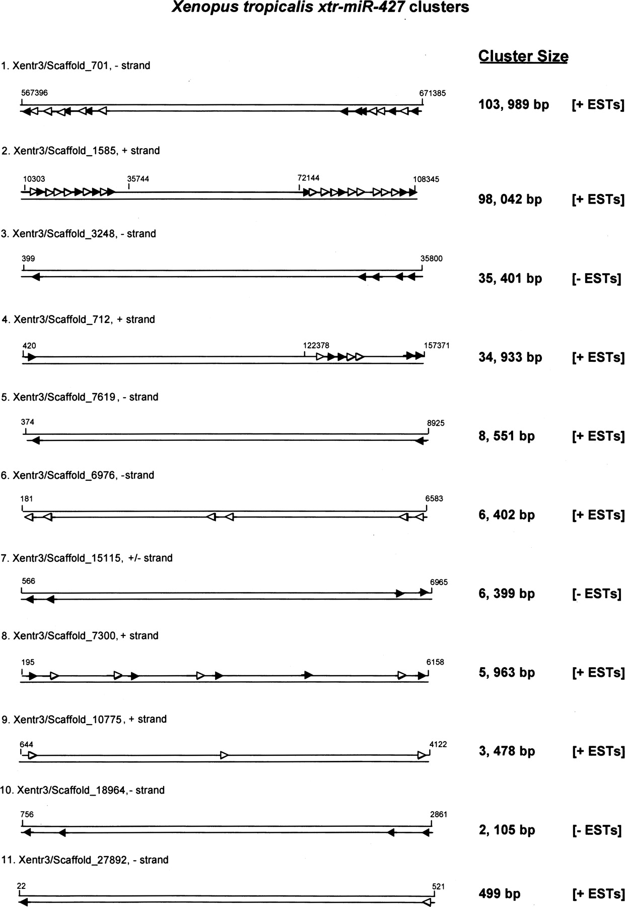Xenopus tropicalis mir-427 clusters. Schematic presentation of identified X. tropicalis mir-427 clusters. Specific scaffolds are designated with scaffold boundary nucleotides indicated at each terminus. The largest to smallest DNA scaffolds are presented from top to bottom with the scaffold total length in nucleotides indicated at the side. Arrows indicate individual xtr-mir-427 genes. For some clusters, the open triangles indicate absent miRNAs in transcribed ESTs. The top strand of each scaffold is the +DNA strand and the bottom strand is the –DNA strand. +ESTs indicate evidence for cotranscription of each cluster (Supplemental Table 3).