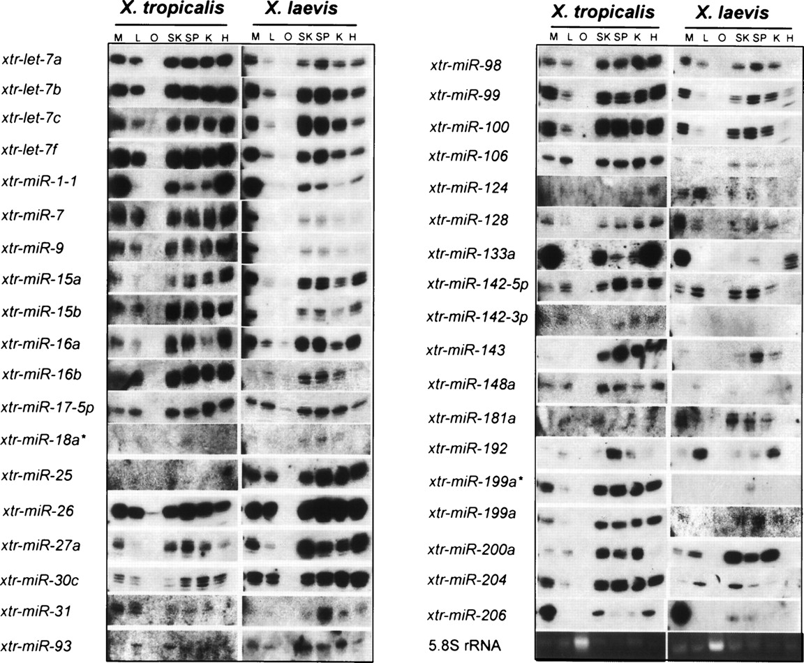 Northern blot validation of computationally identified Xenopus tropicalis and Xenopus laevis miRNAs. Total RNA was isolated from X. tropicalis and X. laevis oocytes and adult tissues, resolved on denaturing polyacrylamide gels, electroblotted to nylon membranes, and hybridized with DNA oligonucleotides complementary to computationally identified Xenopus miRNAs. Specific Xenopus miRNAs sequences probed with complementary DNA oligonucleotides are indicated at left. Xenopus tissues extracted for RNA analysis are indicated at the top. (M) Muscle; (L) liver; (O) oocyte; (SK) skin; (SP) spleen; (K) kidney; (H) heart.