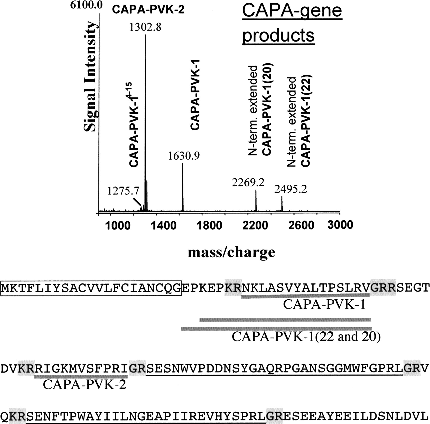 Representative MALDI-TOF mass spectrum of a single anterodorsal ganglionic sheath preparation of abdominal ganglion-2 (neurohemal release site of CAPA-peptides) of an adult Tribolium. The direct mass spectrometric screening of nervous tissues may provide reproducible semiquantitative data. Note the different abundances of the expressed capa peptides. CAPA-PVK-1, which is present with a number of truncated/extended forms, has a lower signal intensity than CAPA-PVK-2; CAPA-pyrokinin is not detectable at all. Lower panel shows the annotated sequence with thick gray lines for the peptides determined in the mass spectrometric analysis as shown in the upper panel. Underlines are for putative mature peptides containing C-terminal -PRX motifs, and the letters with gray backgrounds are canonical signals for amidations and/or basic cleavages. Putative signal peptide is boxed.