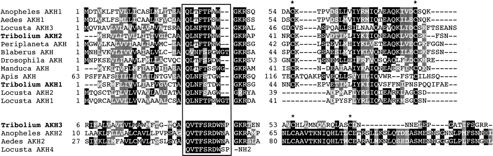 Sequence alignment of adipokinetic hormones (AKH). The mature peptides are in the box and followed by the glycine required for amidation and dibasic cleavage sites. Conserved cysteines are marked by asterisks (*) on the top of the alignment. Note that the middle of the sequence is omitted. Sequences are from Anopheles_AKH1 (ABD43194.1), Aedes_AKH1(EAT35885.1), Locusta_AKH3 (P19872), Periplaneta_AKH (AAV41425.1), Blaberus_AKH (Q17128), Drosophila_AKH (NP_523918.1), Manduca_AKH (P67788), Apis_AKH (from Hummon et al. 2006), Locusta_AKH2 (P08379), Locusta_AKH1 (P55319), Anopheles_AKH2 (ABD60145.1), Aedes_AKH2 (EAT37004.1), and Locusta_AKH4 (Siegert 1999).
