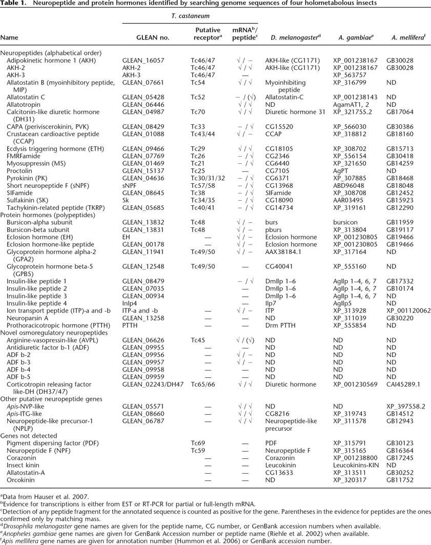 dDrosophila melanogaster gene names are given for the peptide name, CG number, or GenBank accession numbers when available.