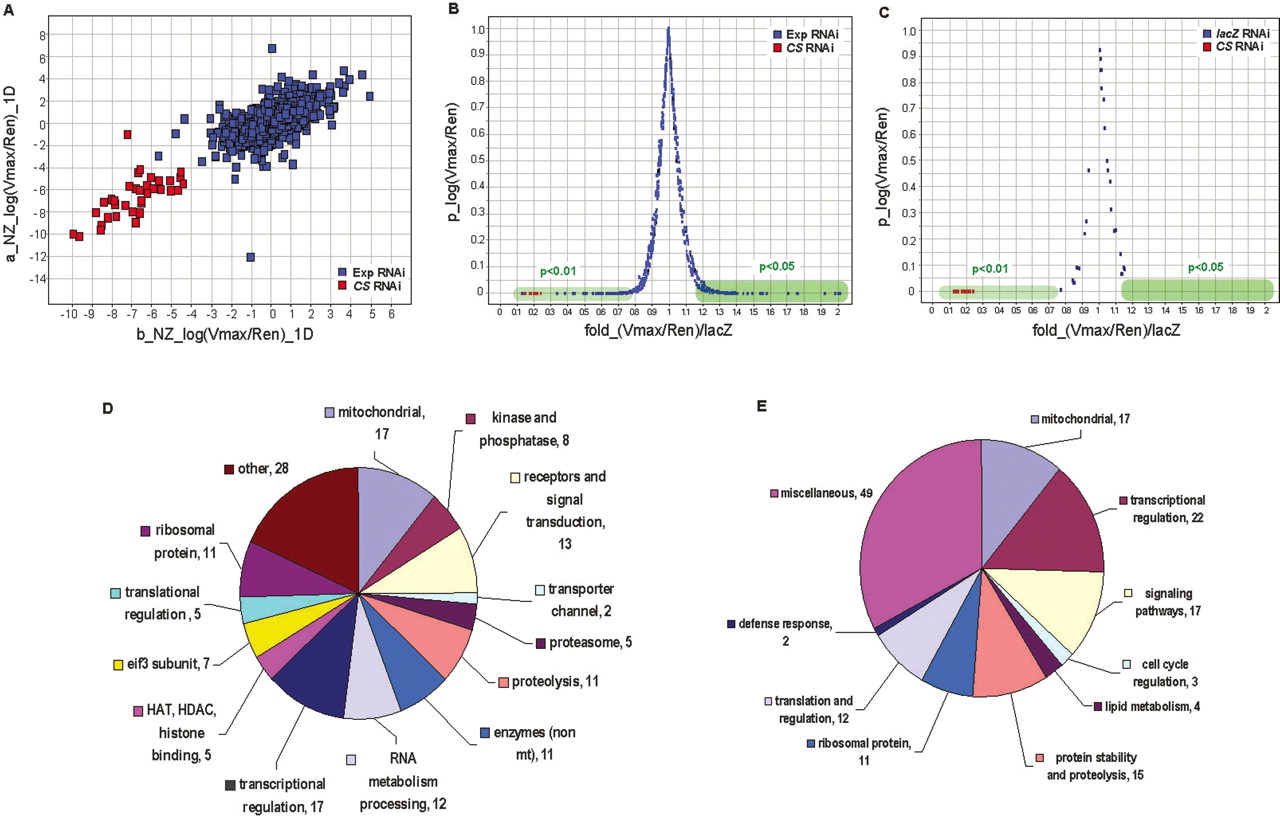 Whole genome RNAi screen. (A) The scatter plot shows the data from the first 12 duplicated plates of the primary screen. The X- and Y-axes represent NZ1D for replica b and replica a, respectively. Each spot represents the result of one dsRNA. The Citrate synthase dsRNA concentration was used as 5 μg/mL. “Exp RNAi” indicates experimental RNAi, “CS RNAi” indicates control Citrate synthase RNAi. (B) The result of confirmation screen for the primary hits. The X-axis represents average fold change of normalized CS activity induced by a dsRNA (six replicates) against the lacZ RNAi controls. The Y-axis represents P-value. Hits were selected based on their P-values against lacZ RNAi controls. The hits that negatively affect CS activities (their RNAi result in an increase in CS activity) were selected if their P < 0.05. The hits that positively affect CS activities (their RNAi result in a decrease in CS activity) were selected if their P < 0.01. The Citrate synthase dsRNA concentration was the same as in A. (C) The distribution of the lacZ RNAi controls in the confirmation screen as shown in B. (D) The classification of the confirmed hits by their molecular functions. (E) The classification of the confirmed hits by their biological processes and pathways.