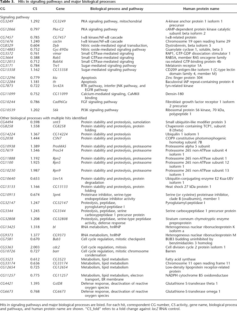 Hits in signaling pathways and major biological processes are listed. For each hit, correspondent CG number, CS activity, gene name, biological process and pathways, and human protein name are shown. “CS_fold” refers to a fold change against lacZ RNAi control.